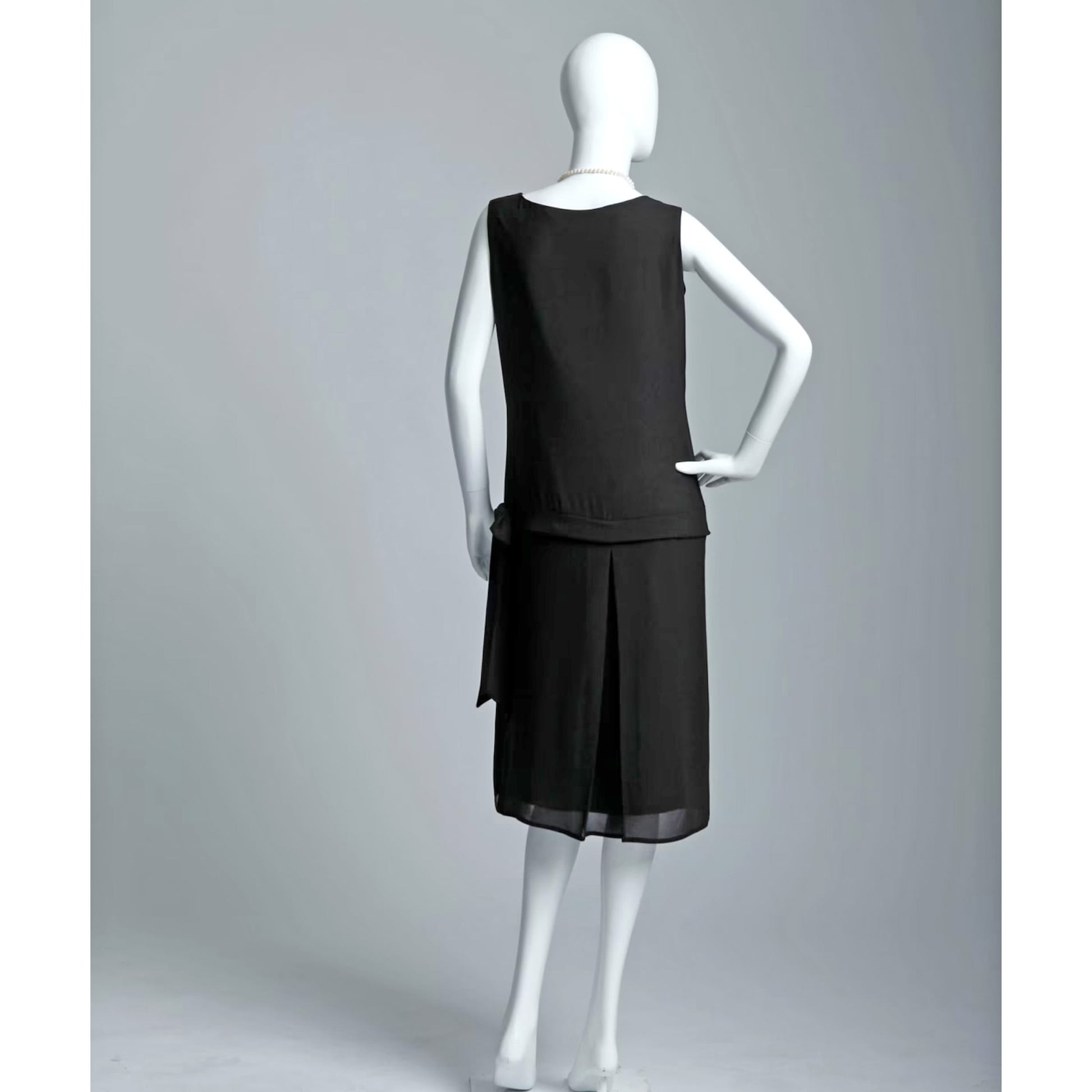 This art deco inspired dress is super chic. It is of black and off-white chiffon fabrics and has decorative off-white panel on the front bodice, which matches the off-white pleated insert of the skirt front. On one side of the hips hangs a little black chiffon bow. The dress is fully lined. The design is drop waist, loose fitting and sleeveless. The dress has no zipper but you can slip it on through the head easily. Thanks to its loose fitting design.