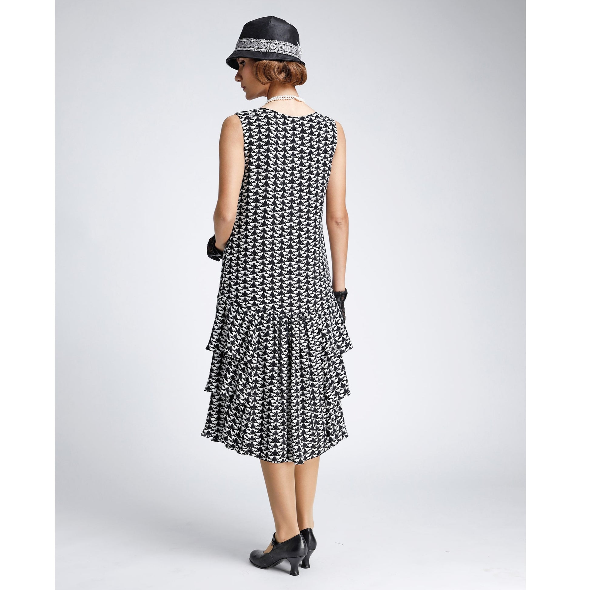 The dress is sleeveless and comes with a round neckline. The design is simple with perfect lines of 1920s fashion. Each side of the skirt has three tiers of ruffles. A small hand-rolled hem is used for the ruffles to allow them to flow and drape freely.