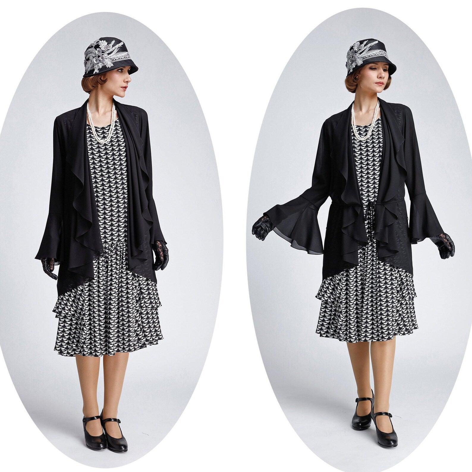 This fun drop waist dress of 1920s fashion is made of black and white chiffon fabric. It's handmade and comes with a tiered skirt. This 1920s costume can be worn, for example, as a Gatsby dress, a 1920s high tea dress or a roaring 20s flapper dress. With this 20s dress you'll stand out at any roaring twenties party.