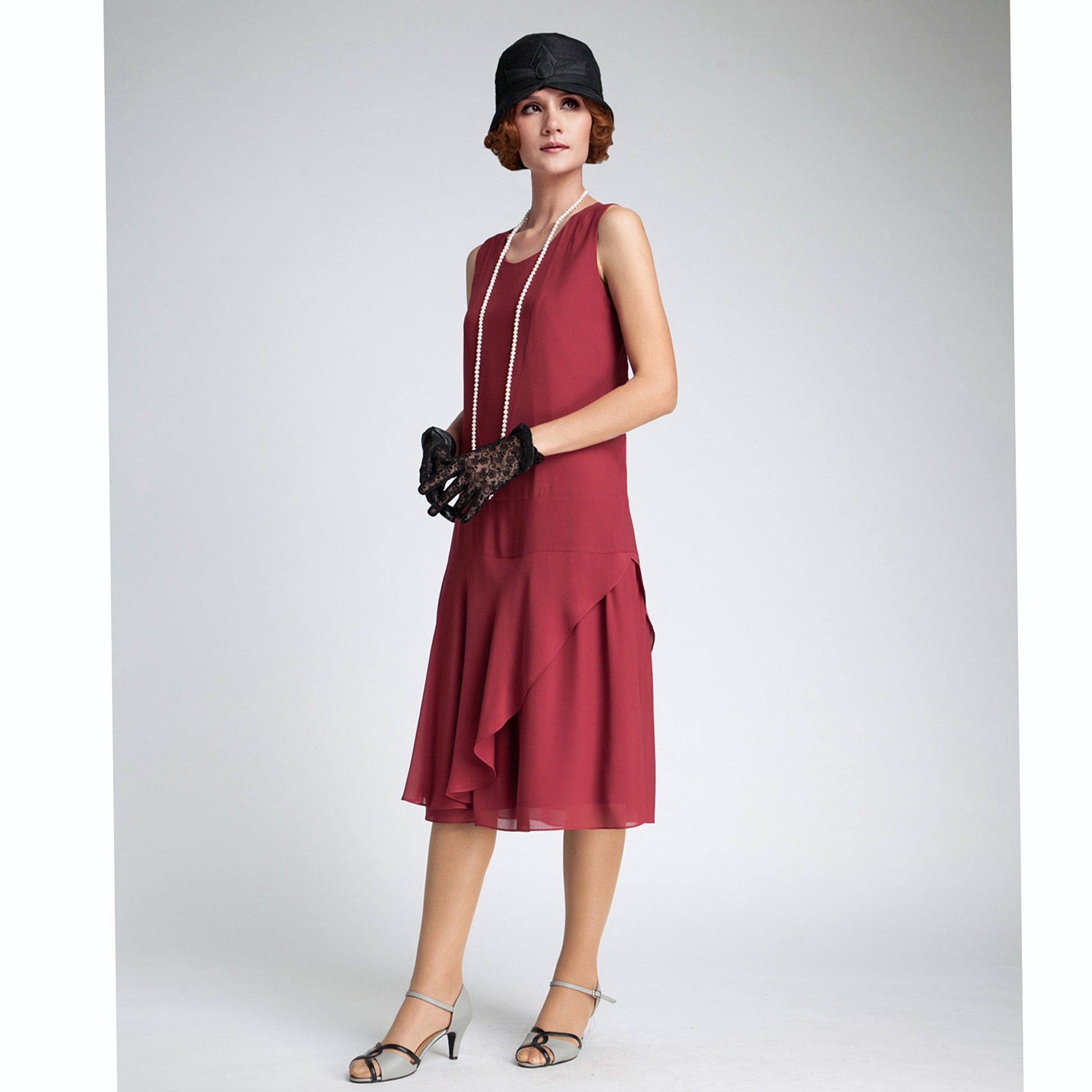 1920s chiffon flapper dress in maroon red with a ruffled skirt detail