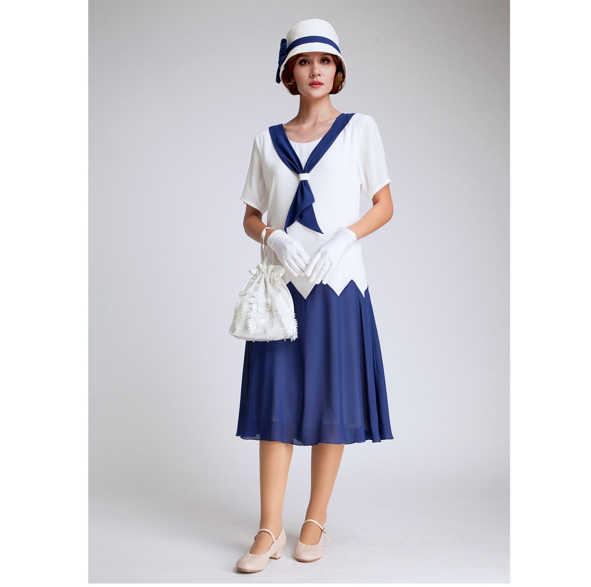 This 1920s cloche hat is made of off-white cotton and dark blue chiffon ribbon. The handmade roaring 20s cloche can be worn, for example, as a Great Gatsby hat, a Downton Abbey high tea hat, a flapper hat or an Art Deco or Jazz Age lawn party hat. It is also a pretty 1920s high tea hat for roaring twenties garden parties.