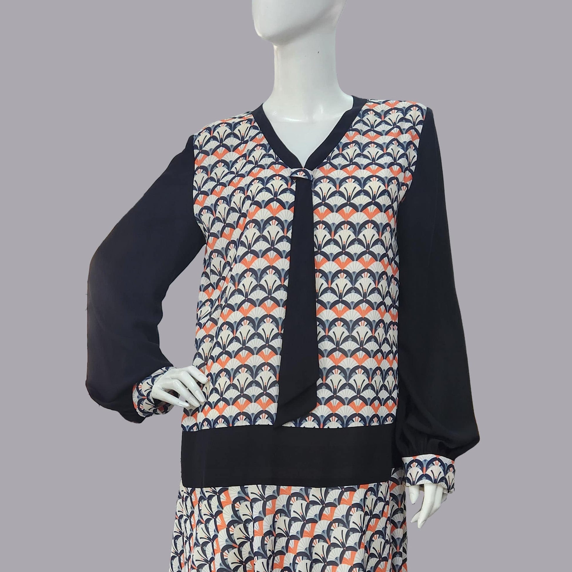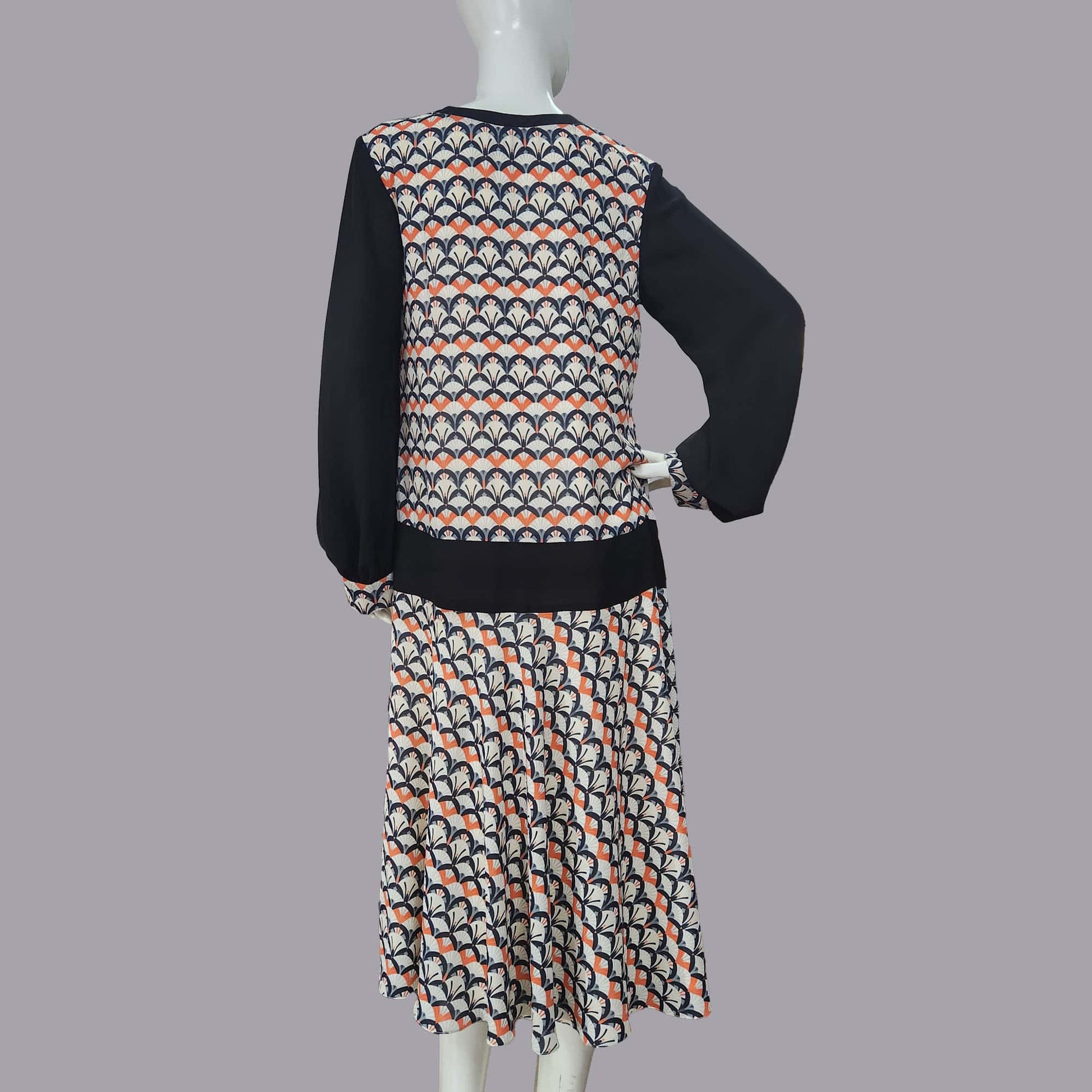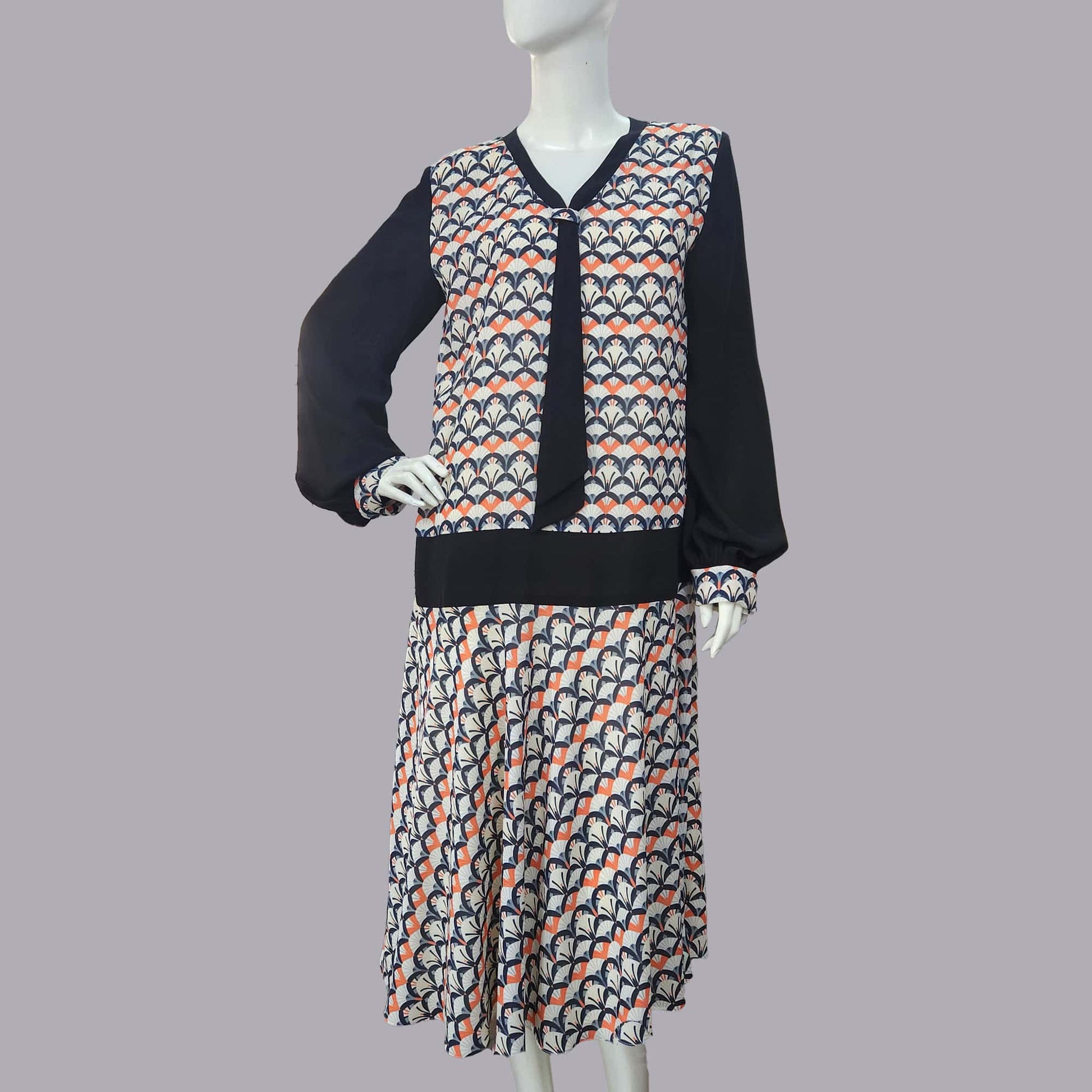 This 1920s fashion dress is handmade in chiffon with a vintage-inspired Art Deco fan design in crisp black, ivory, and terracotta orange, paired with solid black contrasts for a striking color block effect. Its authentic drop waist, emphasized with a bold band, creates a straight Jazz Age silhouette without waist emphasis. With long sleeves to keep you warm, it is a versatile non-flapper dress, perfect for day or evening wear.