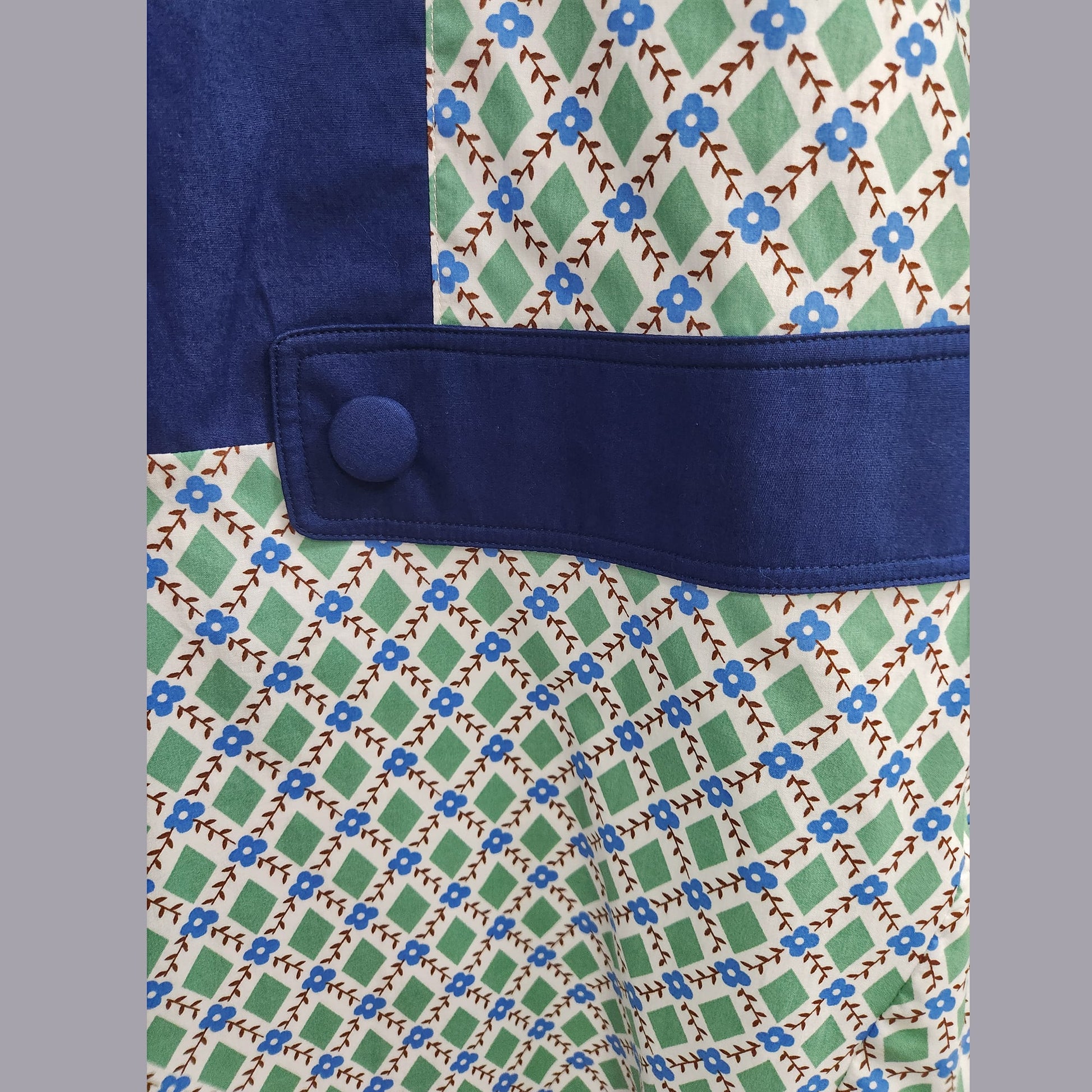 1920s dress in green & white diamond print and dark blue panels