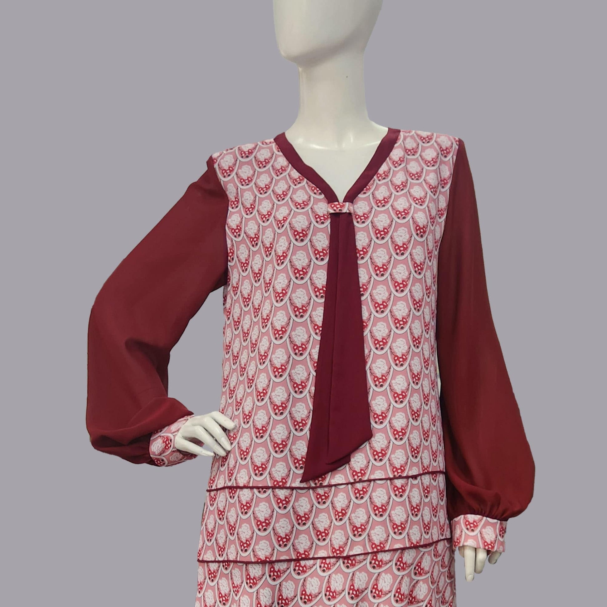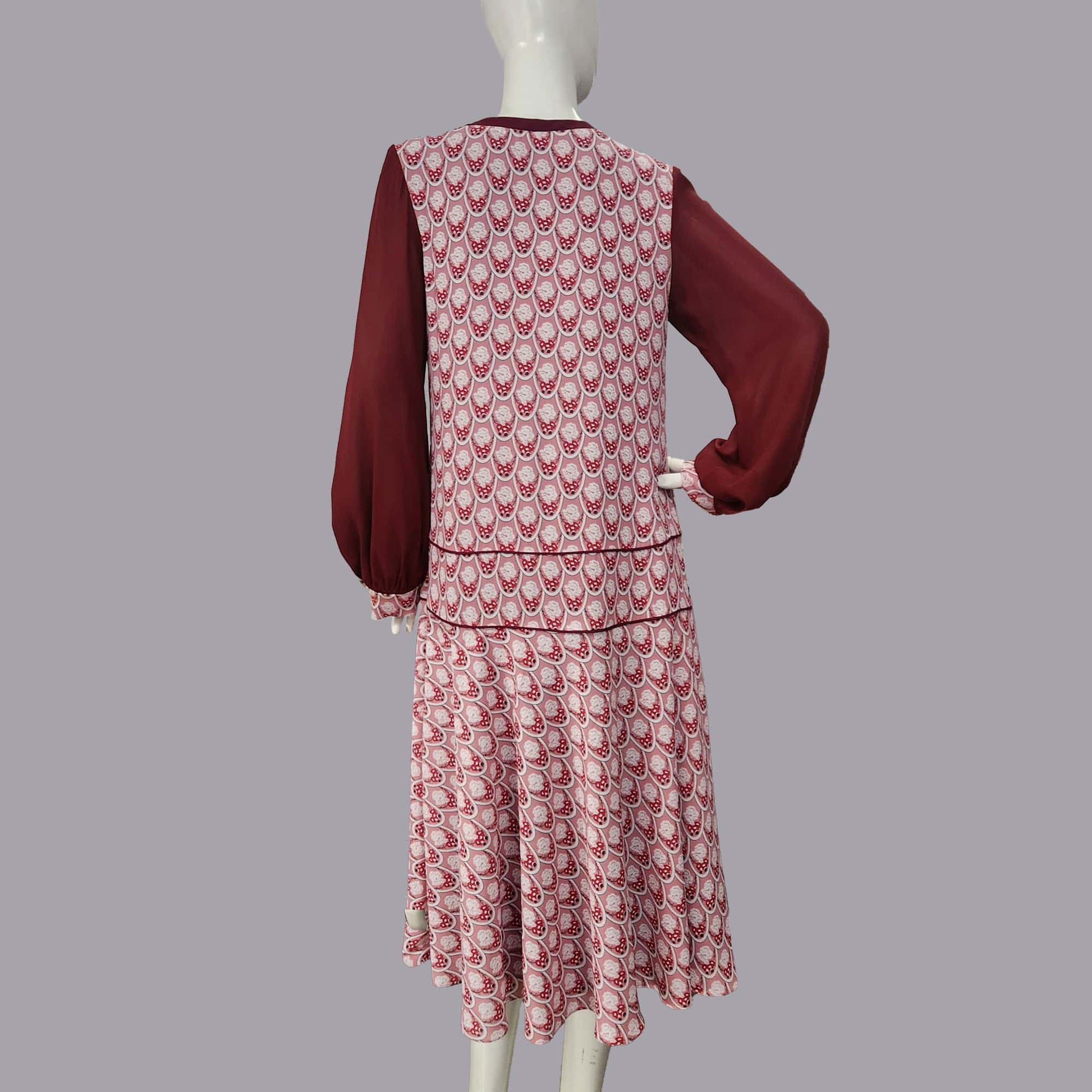 This handmade dress is crafted in soft chiffon fabric, decorated with a cheerful red Art Deco fan print. The neckline, tie, cuffs, and side panels are finished in a rich maroon color, adding depth and contrast. A relaxed drop waist and bias-cut skirt allow for graceful drape, while the long sleeves provide elegance and comfort for cooler days.