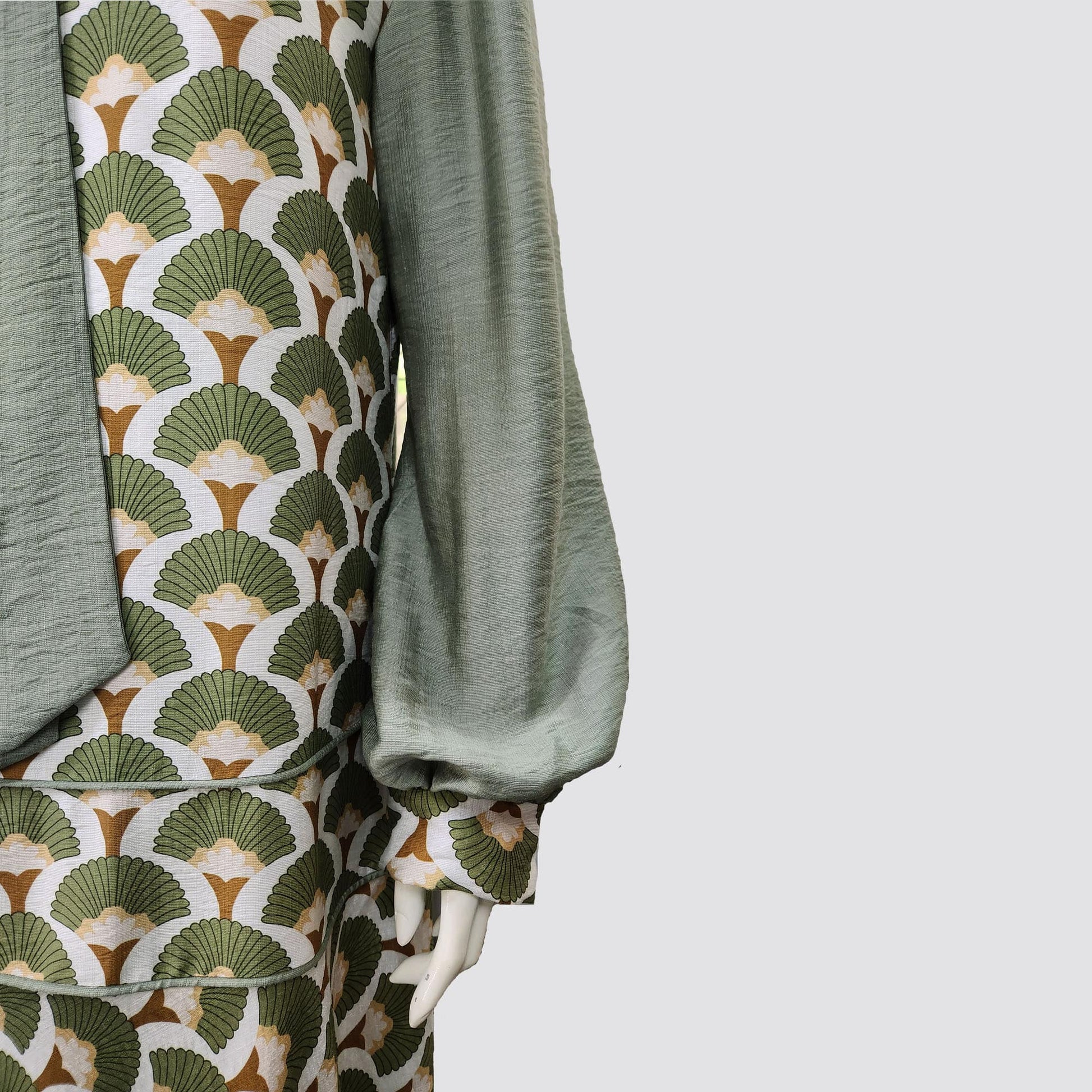 This dress showcases a striking white and green Art Deco palm leaf print, arranged symmetrically across the bodice and skirt for a cohesive vintage look. The solid sage green sleeves and long necktie create soft contrast, adding depth and balance to the patterned fabric. A classic 1920s drop waist defines the silhouette, while the gently flared skirt and gathered long sleeves introduce movement and softness, completing the timeless Gatsby-inspired design.