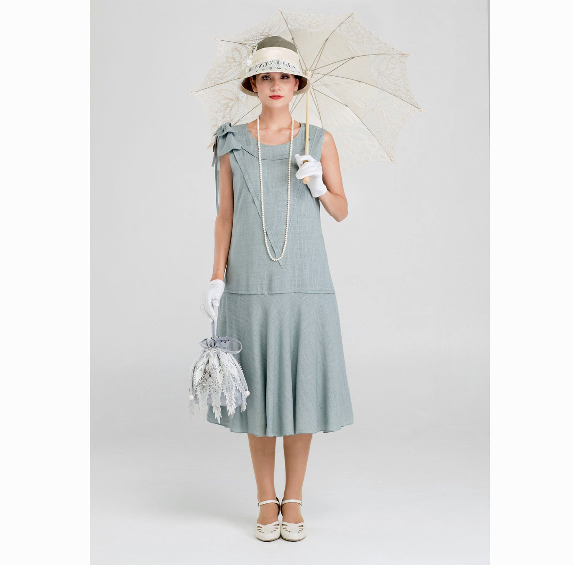1920s grey linen Great Gatsby party dress with shoulder bow