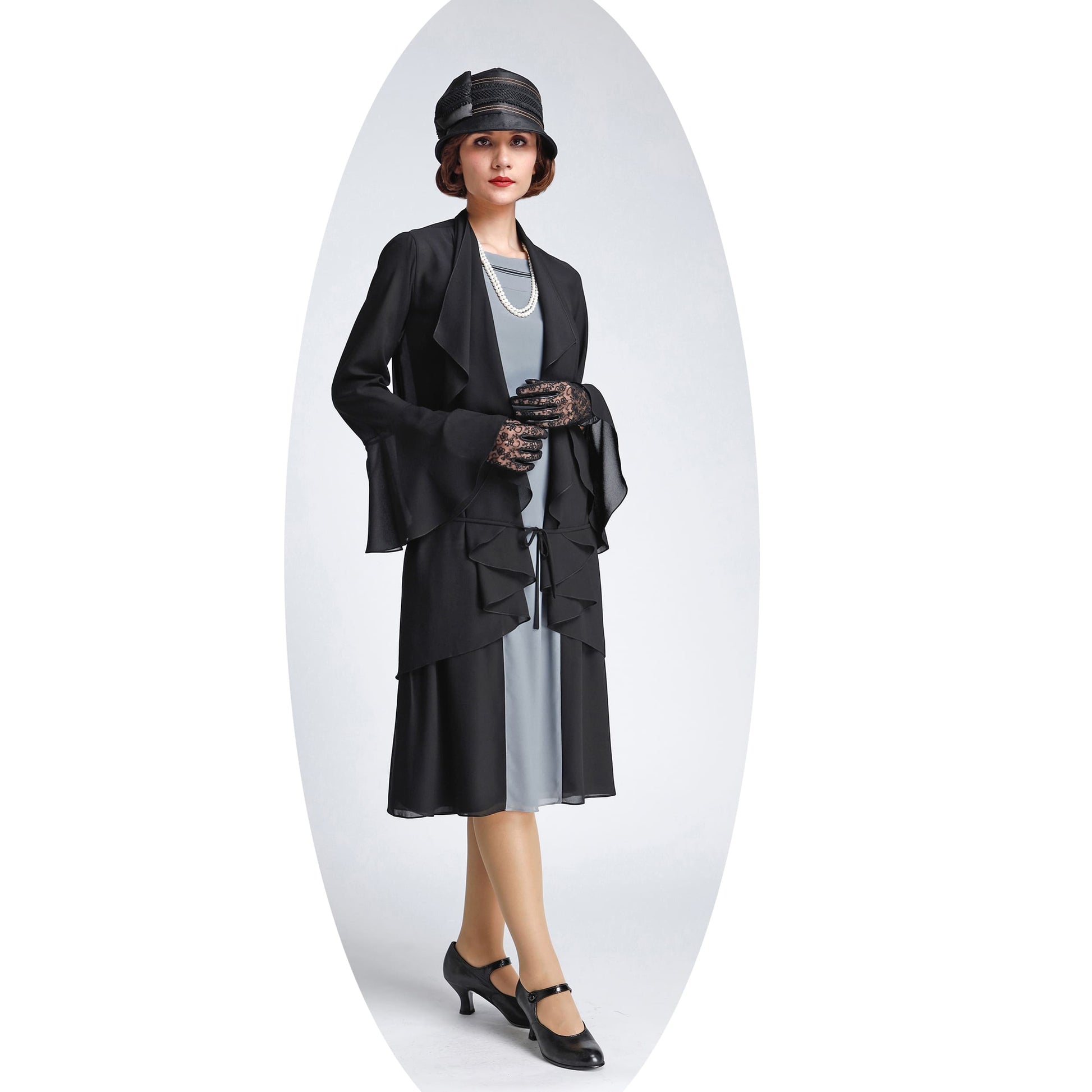 This lovely 1920s Gatsby jacket is made of black chiffon, which can be used for both day and evening parties. This handmade roaring twenties jacket has a cascade collar and can be worn as a Great Gatsby sheer jacket, a 1920s high tea cardigan, a black flapper jacket or a Downton Abbey jacket, among others.