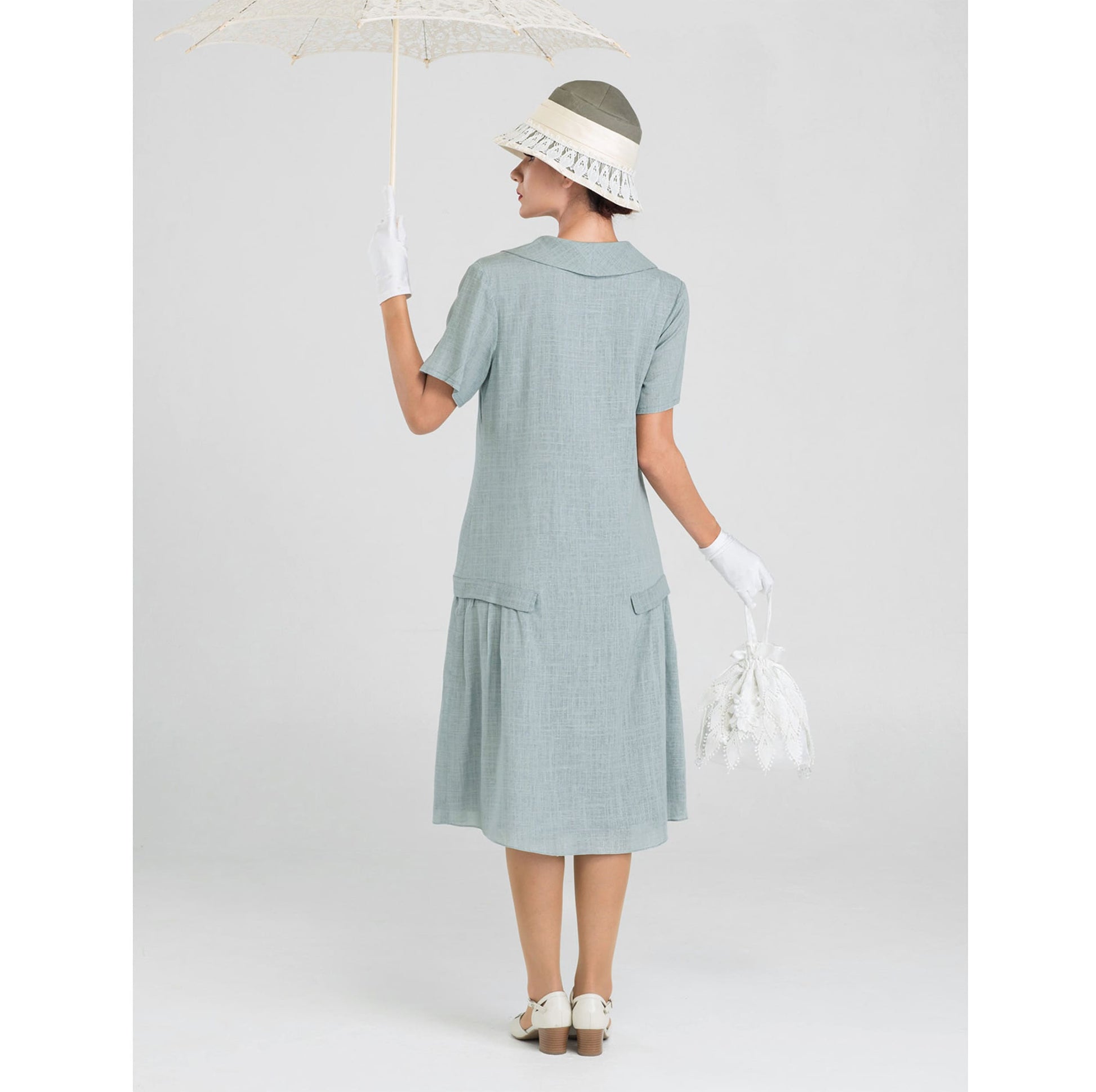 Get dressed to the 1920s with this pretty 1920s day dress made of quality linen fabric in light slate grey (grey with a blue tint). This handmade 1920s tea dress with puritan collar can be worn, for example, as a Jazz Age Lawn Party dress, a Great Gatsby dress or a Downton Abbey dress. An eye-catcher at any roaring twenties party.