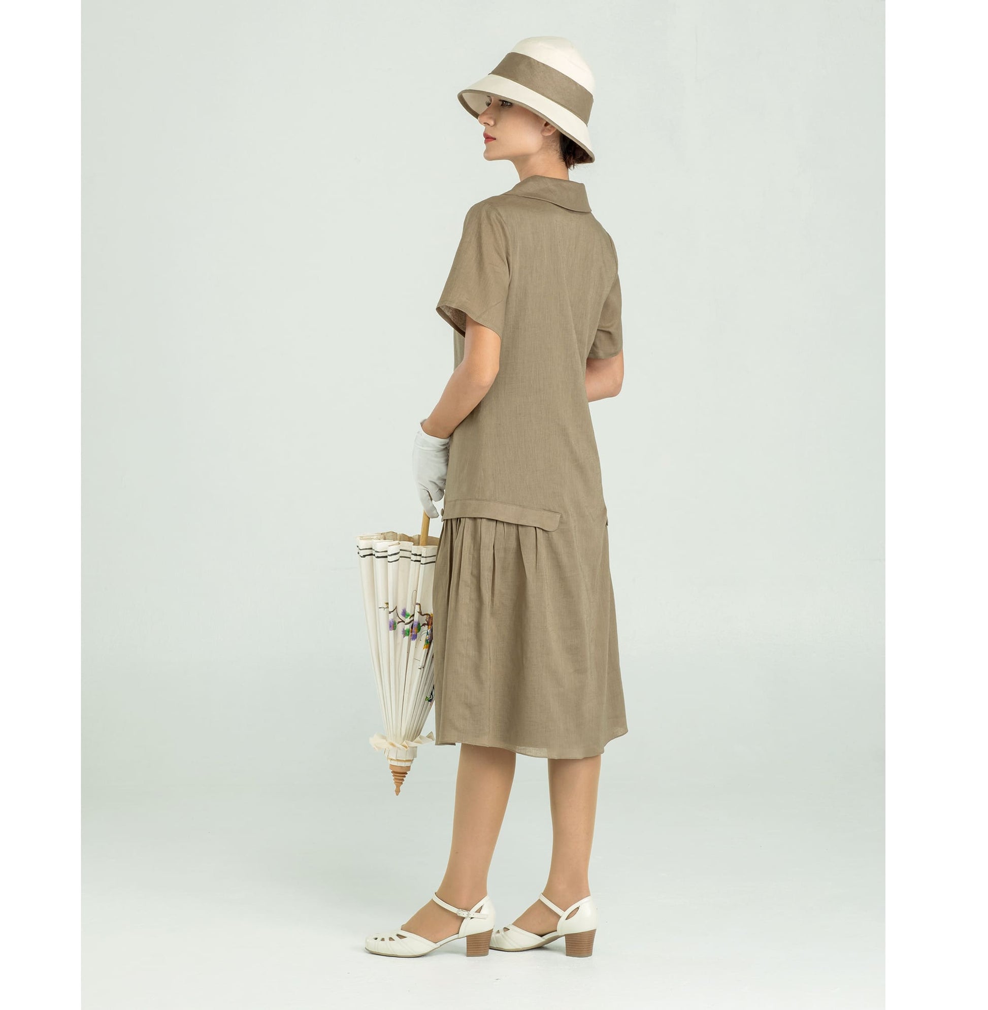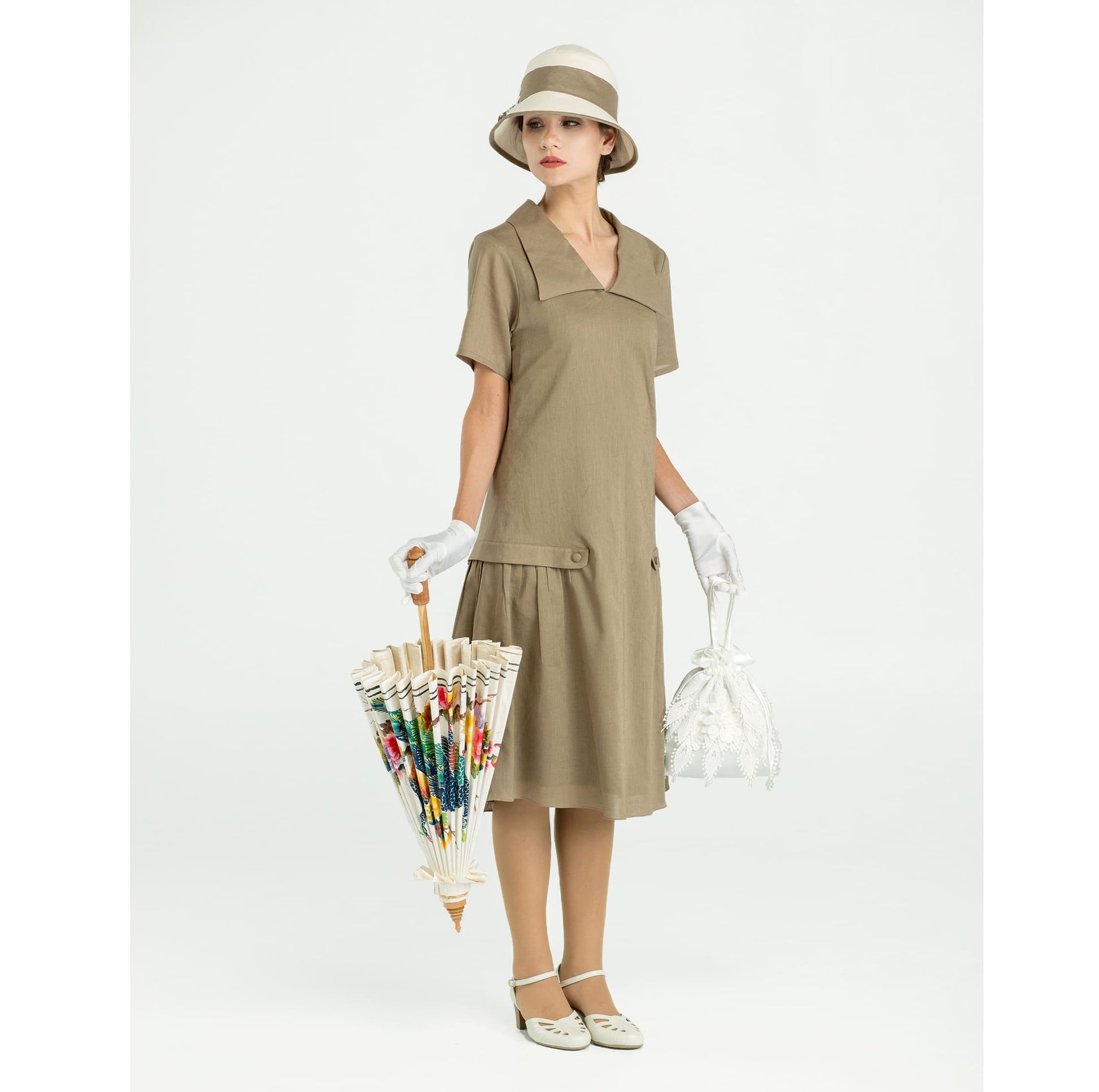 Jazz up with this roaring twenties dress! This pretty 1920s day dress is made of quality linen fabric in olive green. It's handmade and has a puritan collar. This 20s day dress can be worn, for example, as a 1920s high tea dress, a Jazz Age Lawn Party dress or a Downton Abbey dress.