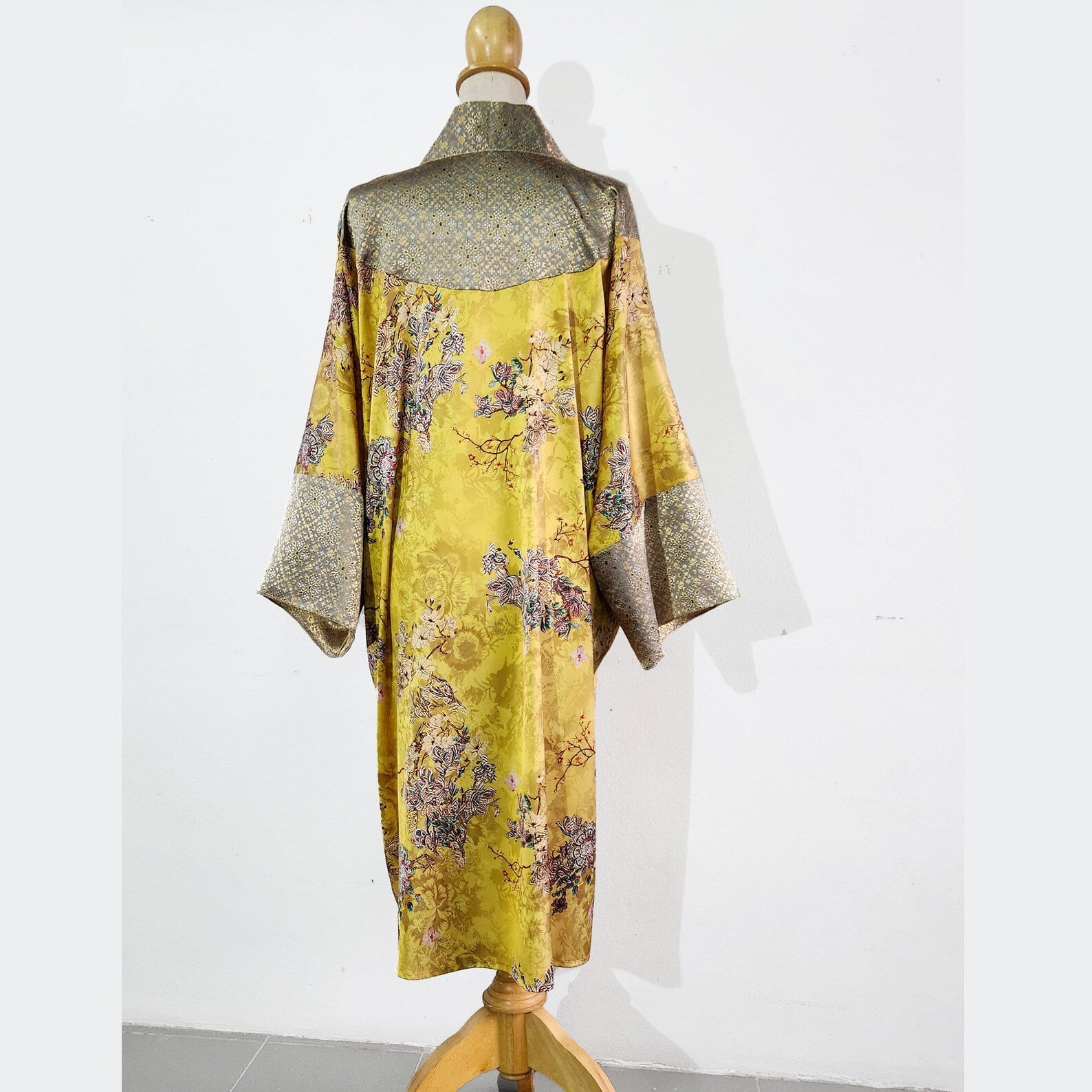 This simply wonderful kimono robe in printed yellow satin is inspired by the 1920s loungewear fashion. If you want to stand out at your next event, this golden satin robe is the right choice for you. The Japanese kimono robe can be worn both as a 1920s night gown and a 1920s coat. This 1920s jacket is exquisite 20s fashion.
