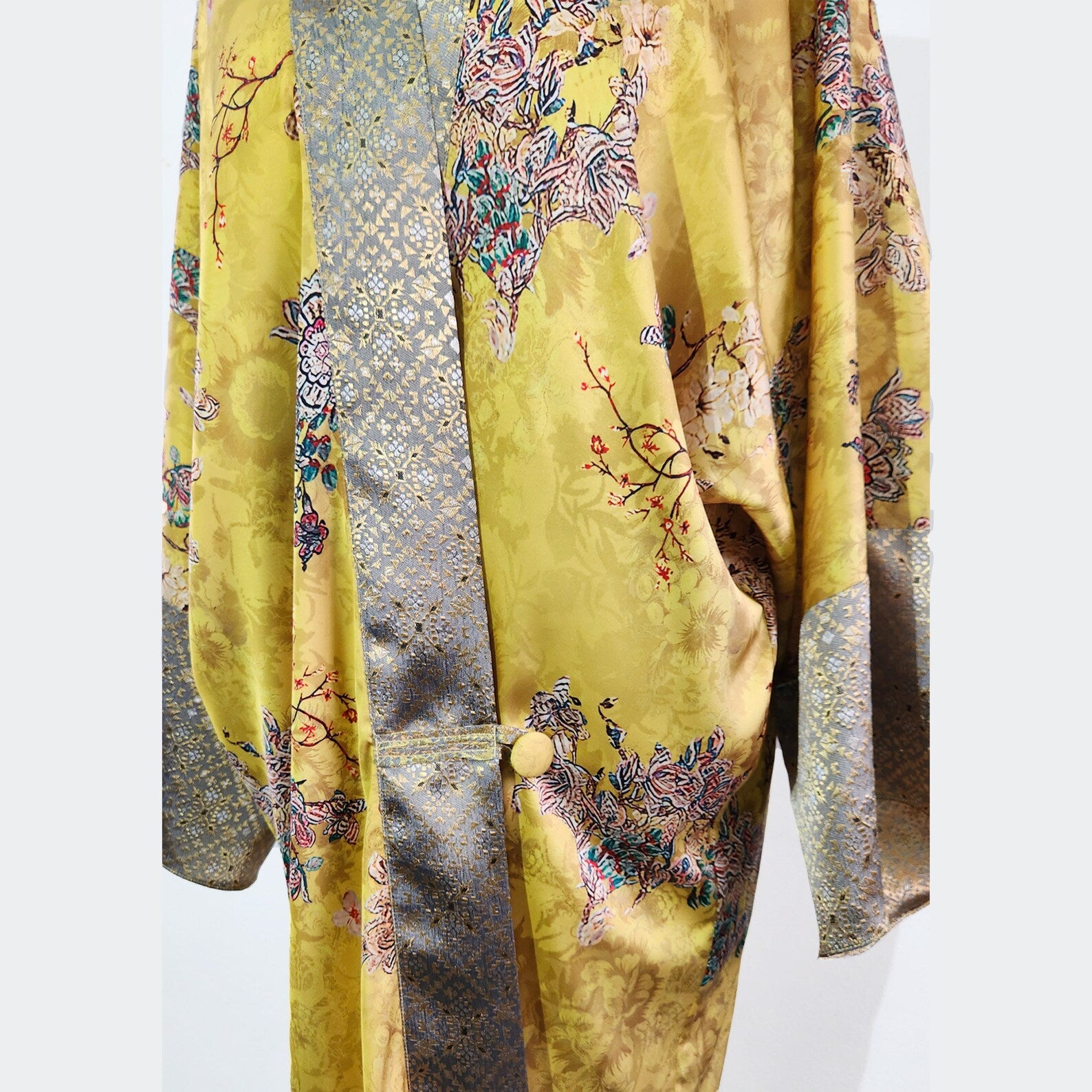 This kimono robe, inspired by the 1920s loungewear fashion, is loosly fitting. It is made of yellow printed satin decorated with woven polyester metallic fabric. It is versatile with a front button closure.