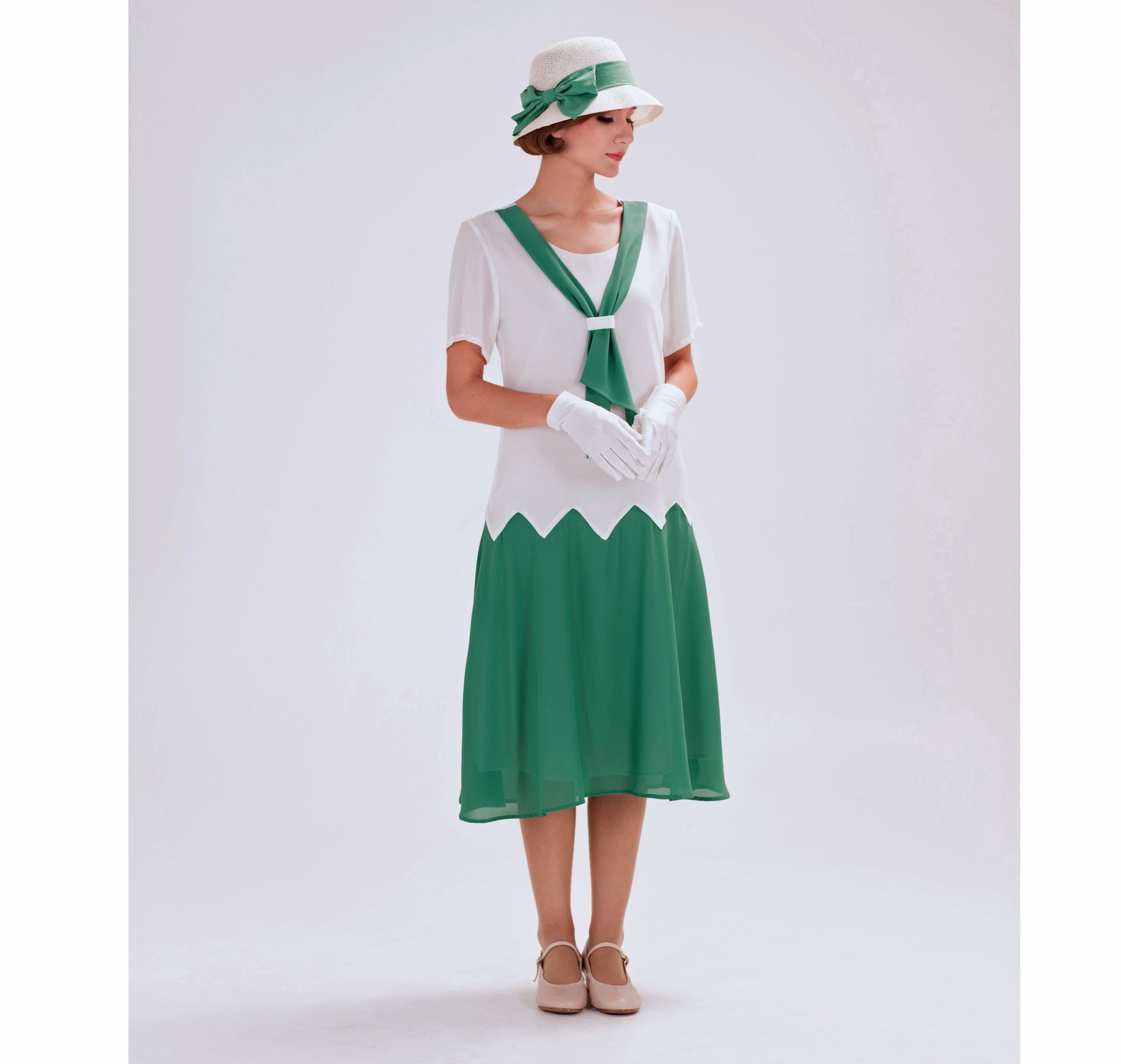 This pretty 1920s-inspired dress is made of chiffon fabric in off-white and jade green with zigzag details. The 1920s dress can be worn as a Great Gatsby party dress, a flapper dress, but also, for example, as a 1920s nautical dress. This robe annees 20 is also nice as a Gatsby navy dress, or to shine at an art deco festival, a roaring twenties lawn party or any other 20s themed party.