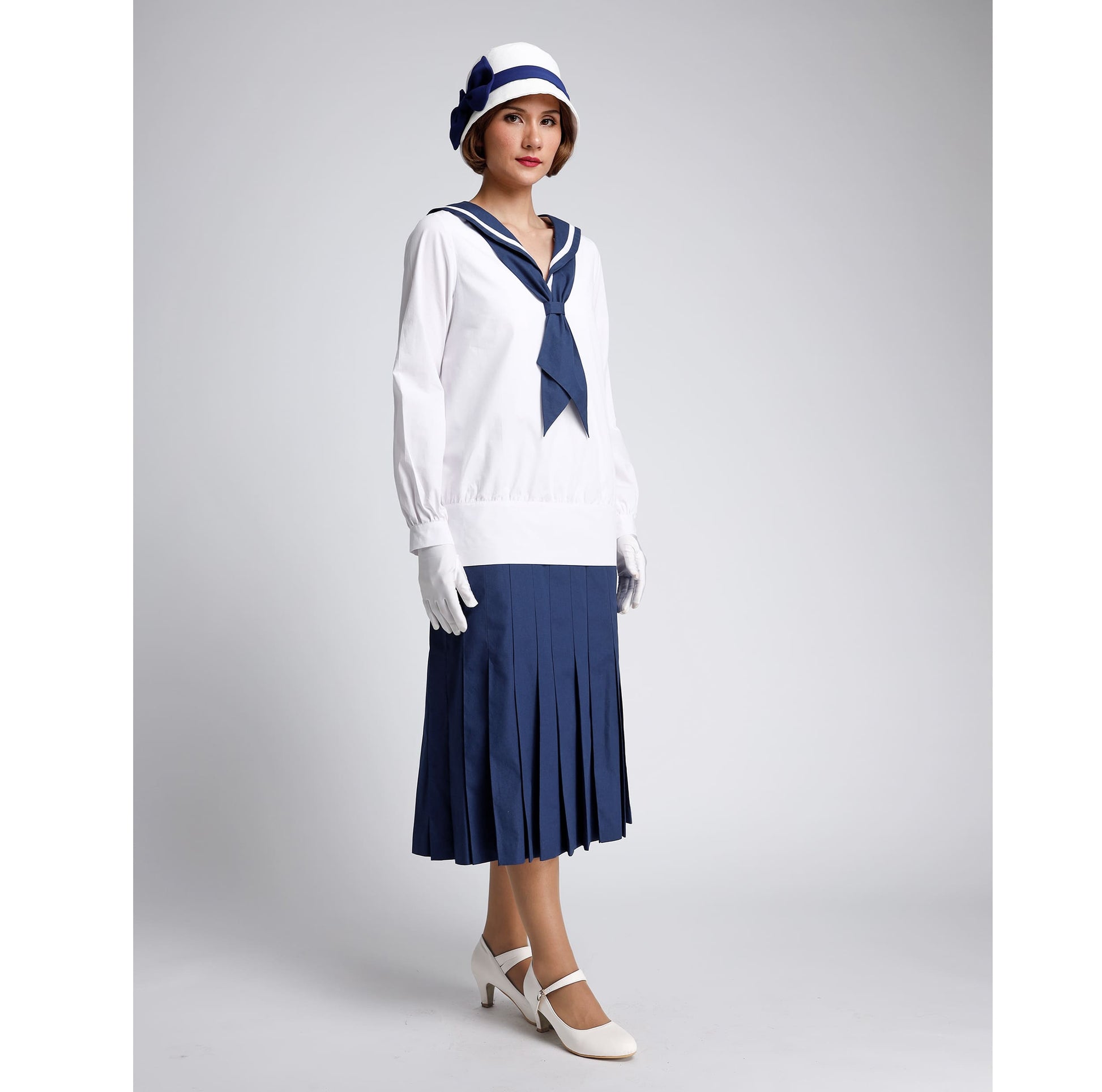 This is a 2-piece sailor ensemble made of white and navy blue cotton. With this neutral color scheme, and classic vintage inspired detailing, the handmade navy dress is easily dressed up or down for any type of event. This 20s nautical dress can be worn, for example, as a Great Gatsby dress or a Miss Fisher dress.