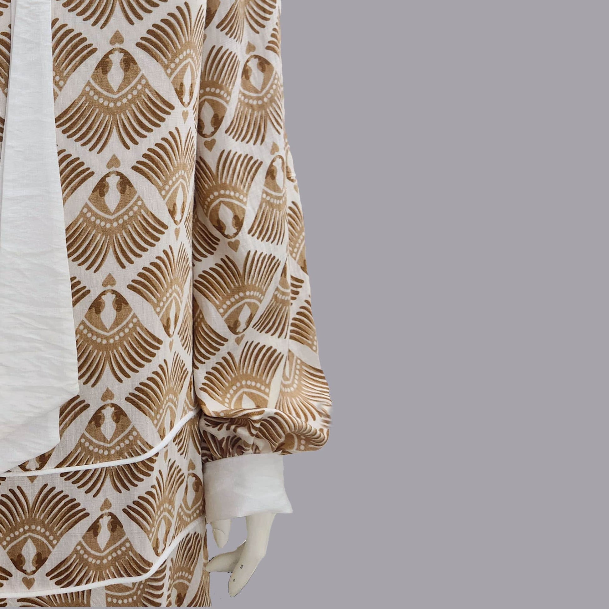 This 1920s inspired Art Deco dress features a striking brown feather print in soft rayon blend, accented with a crisp white necktie, piping, and cuffs. Designed with a flowing drop waist midi silhouette and long printed sleeves, the 1920s dress captures the elegance of the Roaring 20s. A perfect choice for autumn vintage fashion, Gatsby parties, or timeless everyday style.