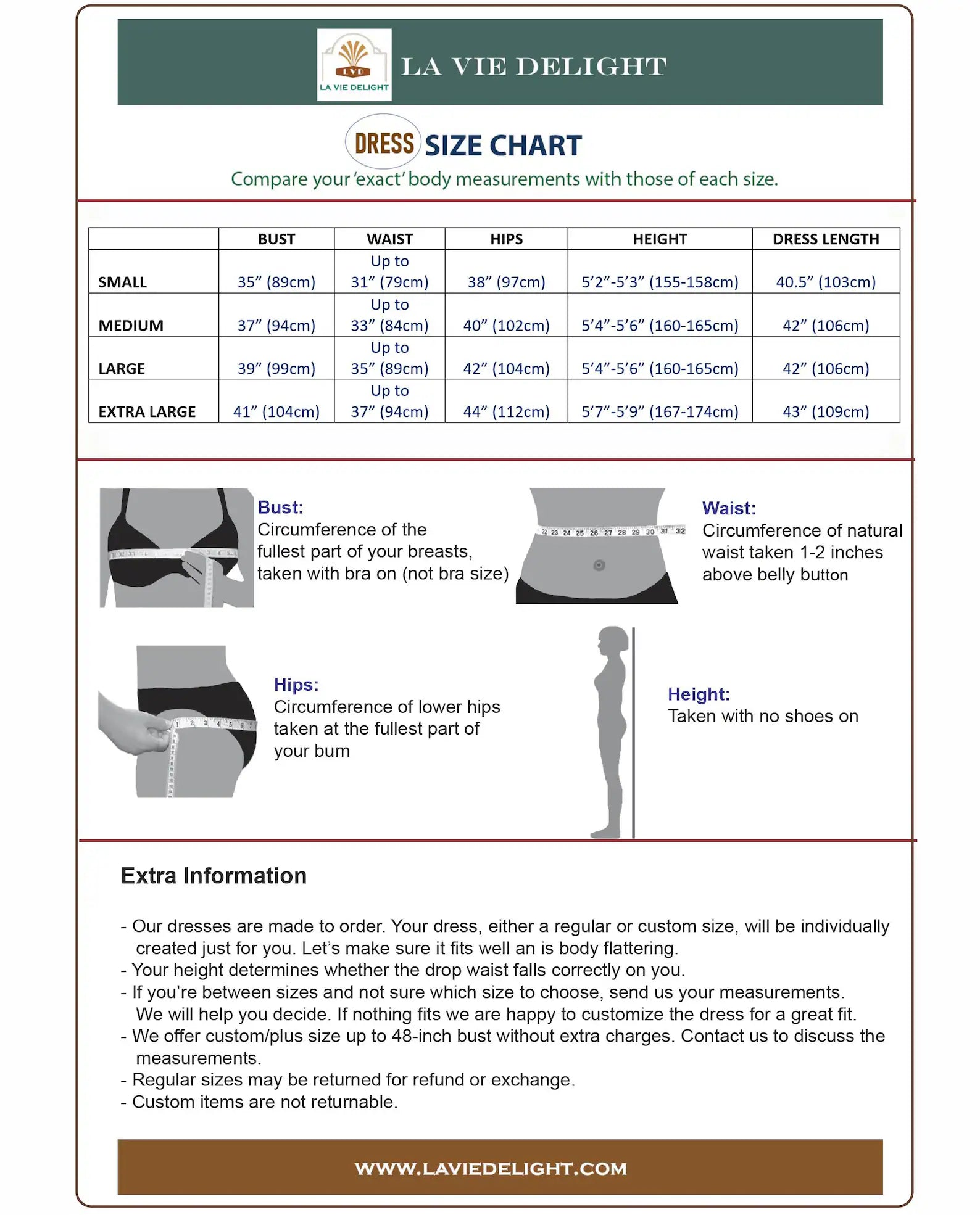 Make sure you know your 'exact' body measurements, which have been measured correctly as instructed above. If you are between sizes send us your measurements and height. We will help consider whether you need a custom size. Most of the time we encourage you have your dress customized to your body measurements and height so that it fits well and is body flattering. And you will look great and feel confident in it. We offer custom orders of up to person's bust of 50”. There are no extra fees for size customization. However, a custom item cannot be returned for refund or exchange. Please contact us first if you would like a custom item before placing your order.