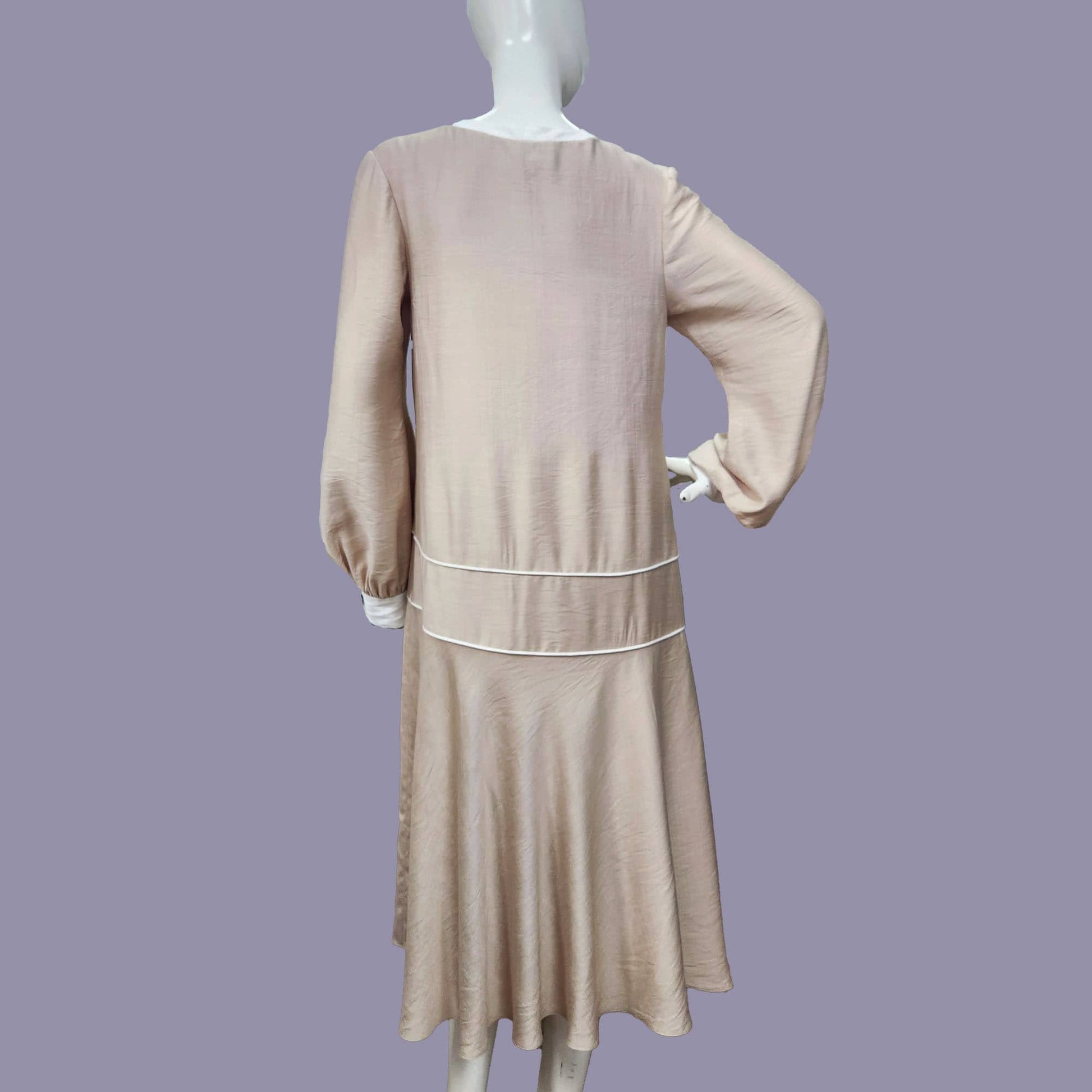 Simplicity defines this 1920s afternoon tea dress. The beige rayon fabric is smooth and breathable, while the off-white accents highlight its clean lines and subtle details. With a loose drop waist, emphasized with piping, fluid skirt, and long sleeves with cuff trim, it offers a neat and charming look for lovers of vintage-inspired elegance.