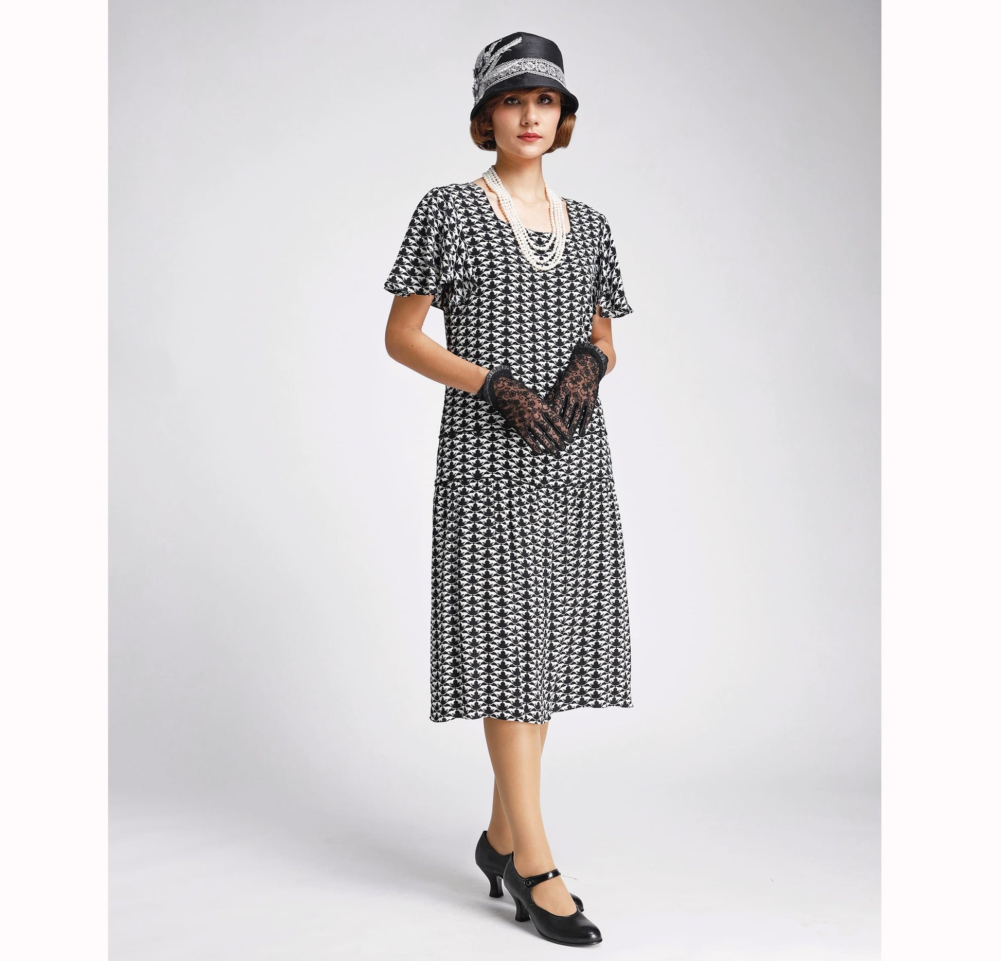 Black and white 1920s Great Gatsby viscose dress with flutter sleeves