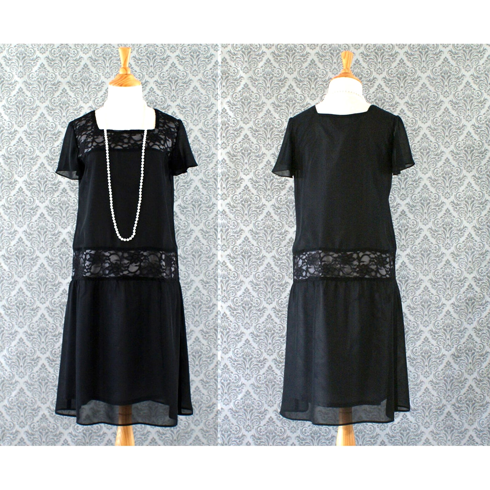 Get ready to party in this 1920s inspired dress made of black chiffon and black lace fabrics. This handmade roaring 20s dress has flutter sleeves and can be worn as a Gatsby dress, a 20s flapper dress, a Downton Abbey dress or a Charleston dress, among others. A great dress for your next Jazz Age lawn party or art deco event.
