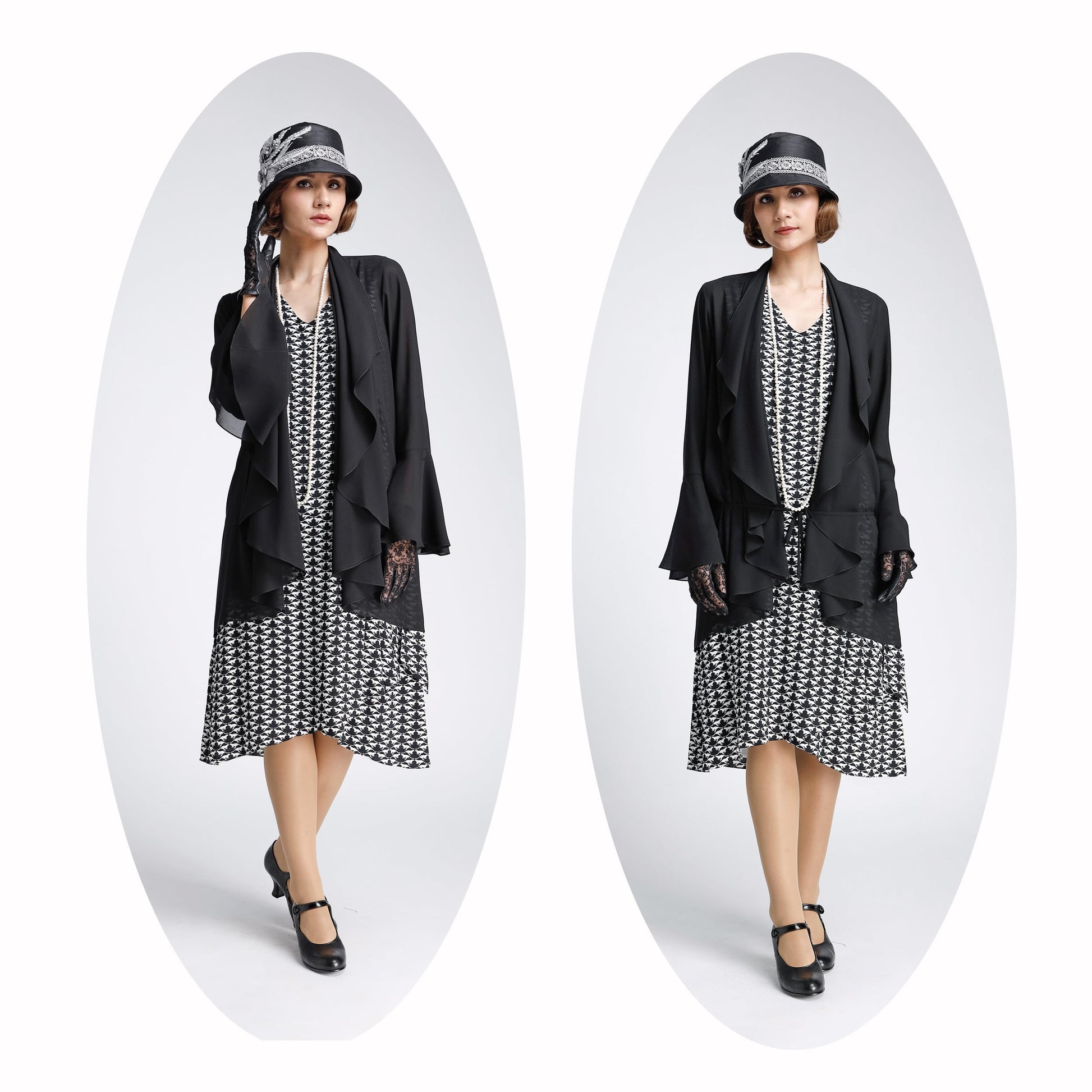 This super chic handmade black and white Roaring Twenties-inspired dress can be worn both as a day and evening dress. The 1920s dress has a drape and bow. It can be worn, for example, as a flapper dress, a Great Gatsby party dress or a Downton Abbey dress. The fabric is quality chiffon with art deco print, which is breathable and very soft to the touch.
