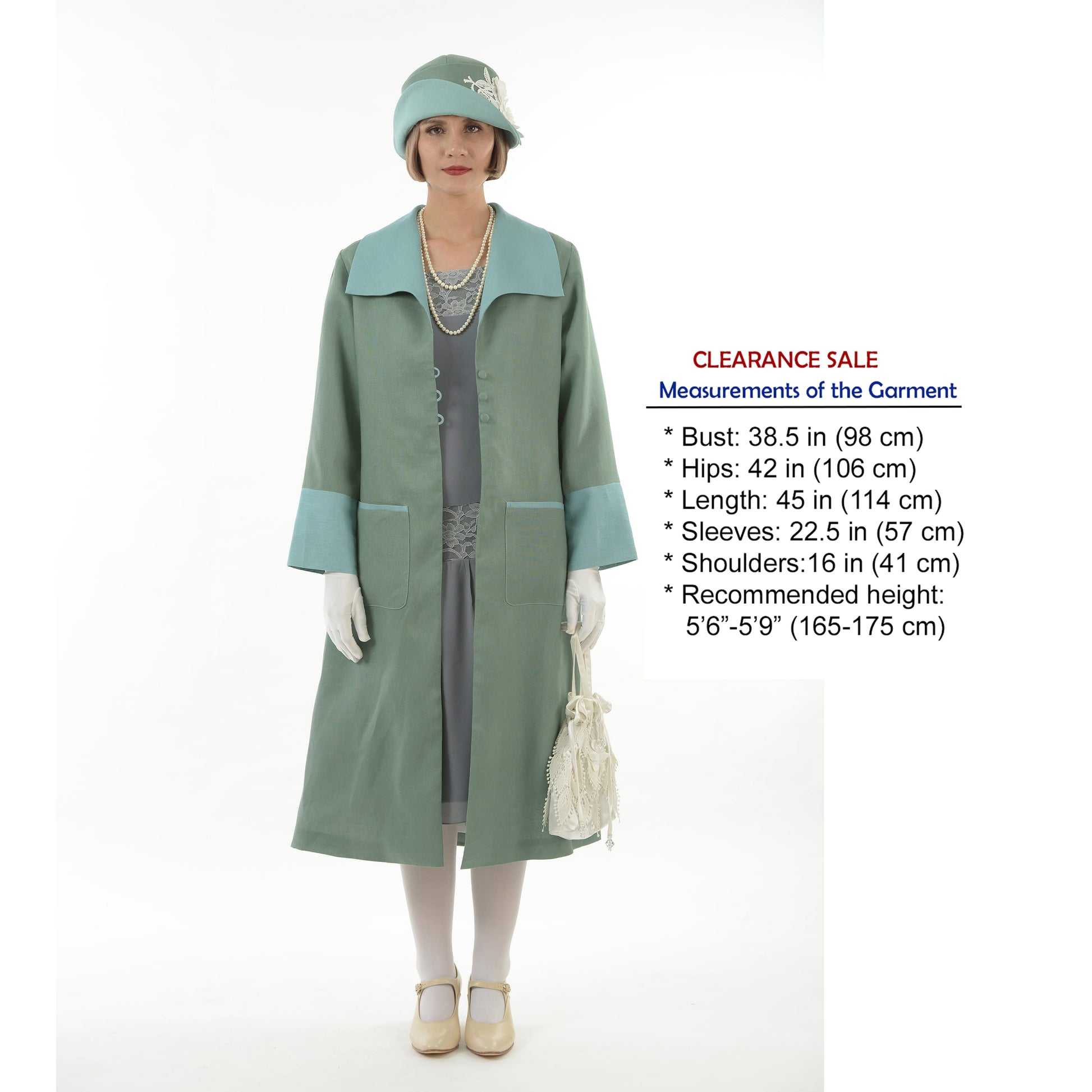 Complete your 1920s wardrobe with this stylish flapper day coat in muted green linen and pastel blue details. This 1920s daywear with wing collar can be worn as a long 20s summer overcoat. It is a nice roaring 20s coat that will steal the show when you go to your next Great Gatsby party or other roaring twenties event.