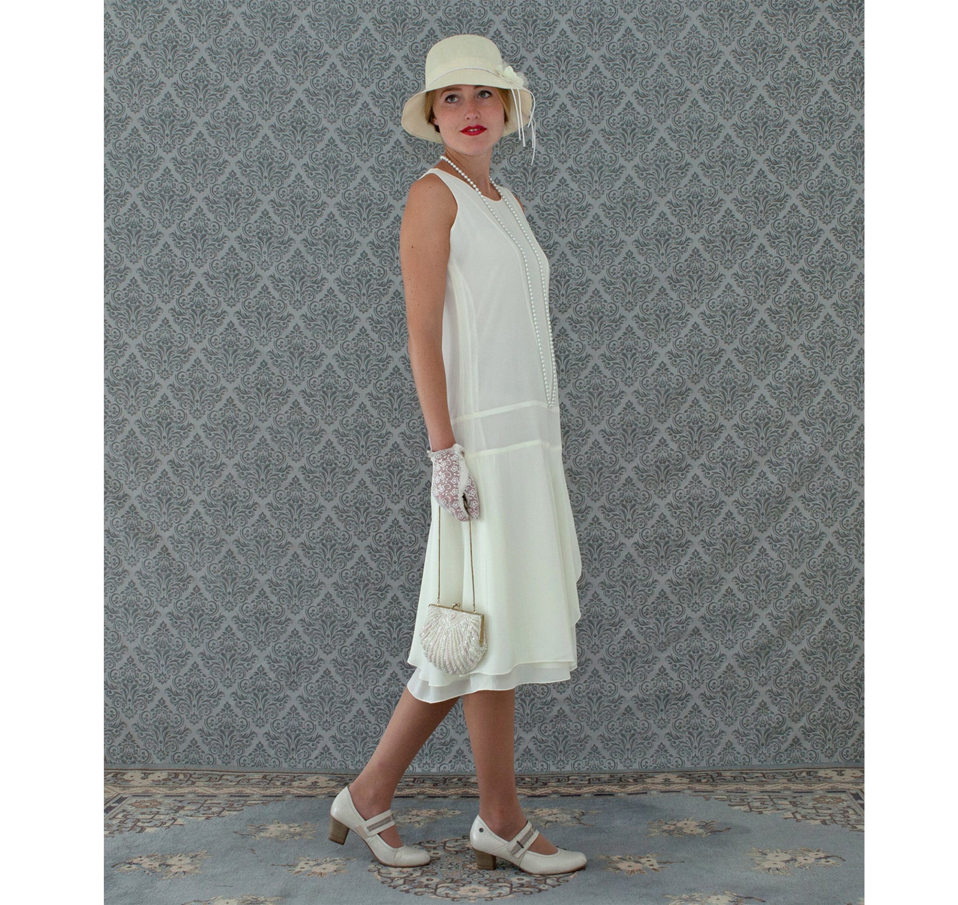 Dance the night away with this lovely cream flapper dress made of chiffon and with a ruffled skirt detail. This handmade roaring 20s dress can be worn, for example, as a Great Gatsby dress, a flapper dress, a Charleston dress, or a 20s high tea dress. It's also a great 1920s civil ceremony wedding gown.