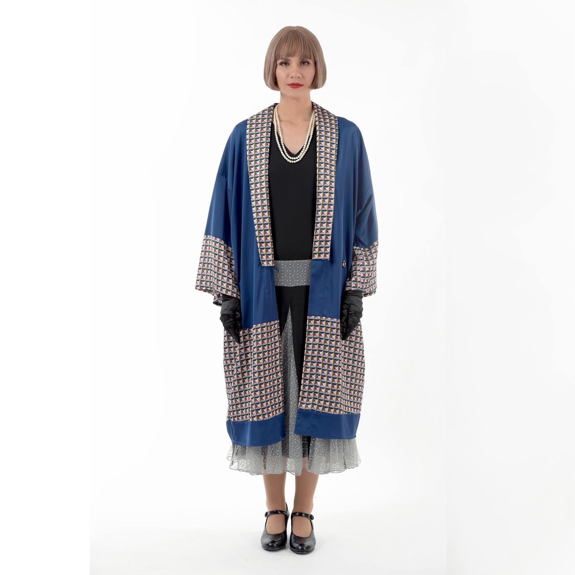 Wearing a 1920s oriental kimono robe makes you feel as if you have transcended time and space. This dark blue kimono robe with geometric print can be worn as a Great Gatsby coat, a 1920s duster jacket, or a 1920s formal jacket, among others. This 1920s loungewear is exquisitely crafted with attention to detail.