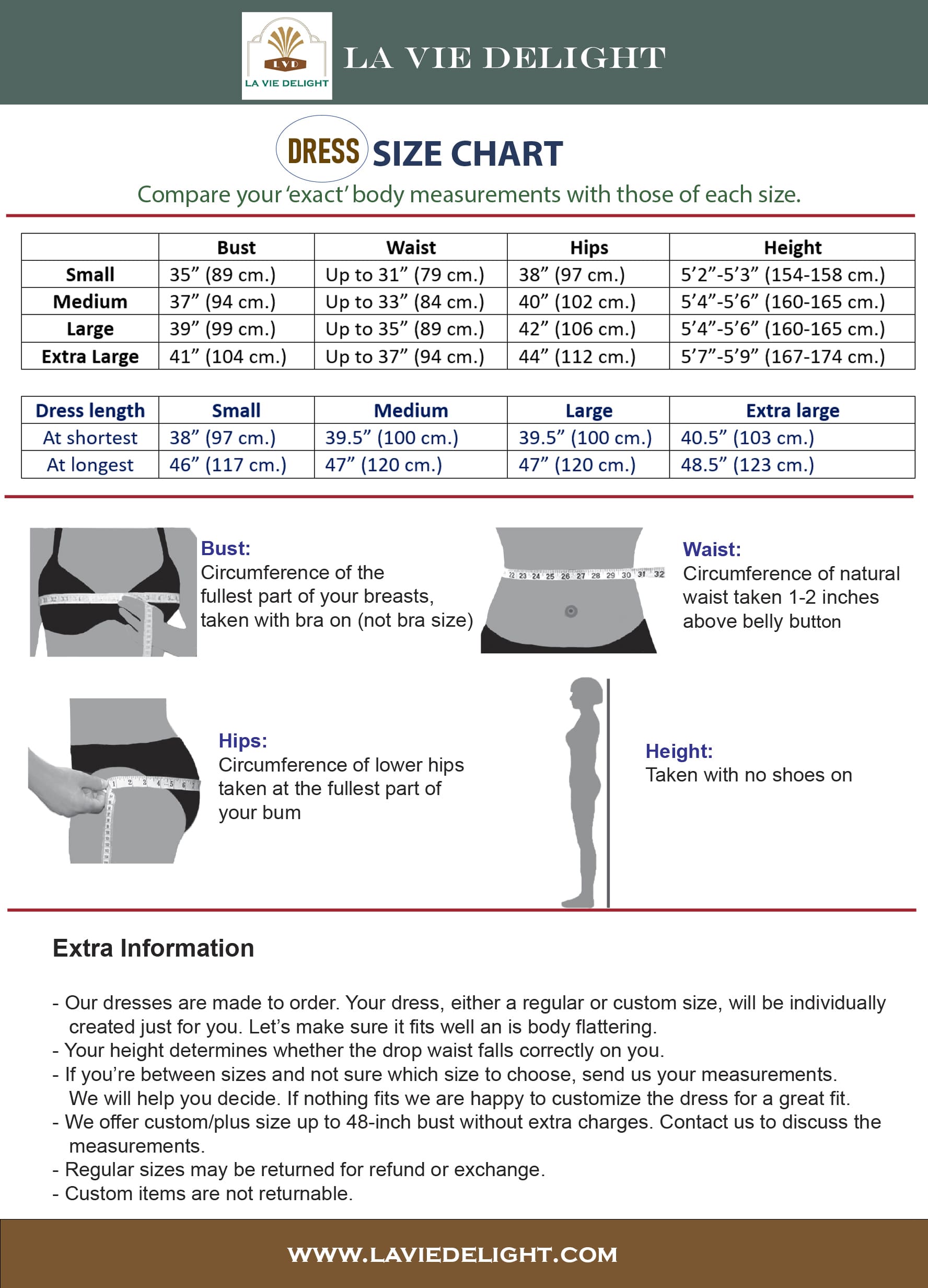 Make sure you know your 'exact' body measurements, which have been measured correctly as instructed in the Size Chart. If you are between sizes send us your measurements and height. We will help consider whether you need a custom size. Most of the time we encourage you have your clothes customized to your body measurements and height so that they fit well, correctly and are body flattering. And you will look great and feel confident in them. We offer custom orders of up to person's bust of 48”. There are no extra fees for size customization. However, a custom item cannot be returned for refund or exchange. Please contact us first if you would like a custom item before placing your order.