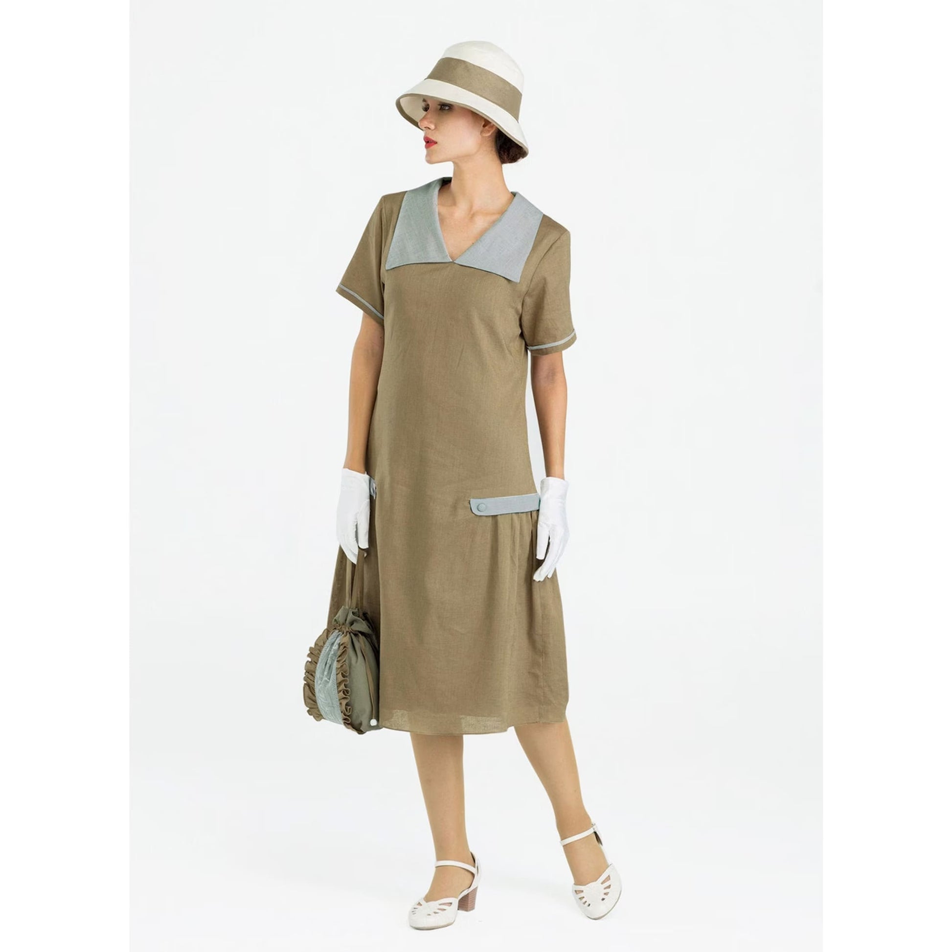 Experience the magic of the roaring 20s in this Downton Abbey inspired 1920s day dress made of quality olive green linen with grey contrast details. It is handmade and features a large puritan collar. This '1920er Kleid' can be worn, for example, as a Lady Mary dress, a Great Gatsby dress or a Charleston dress.