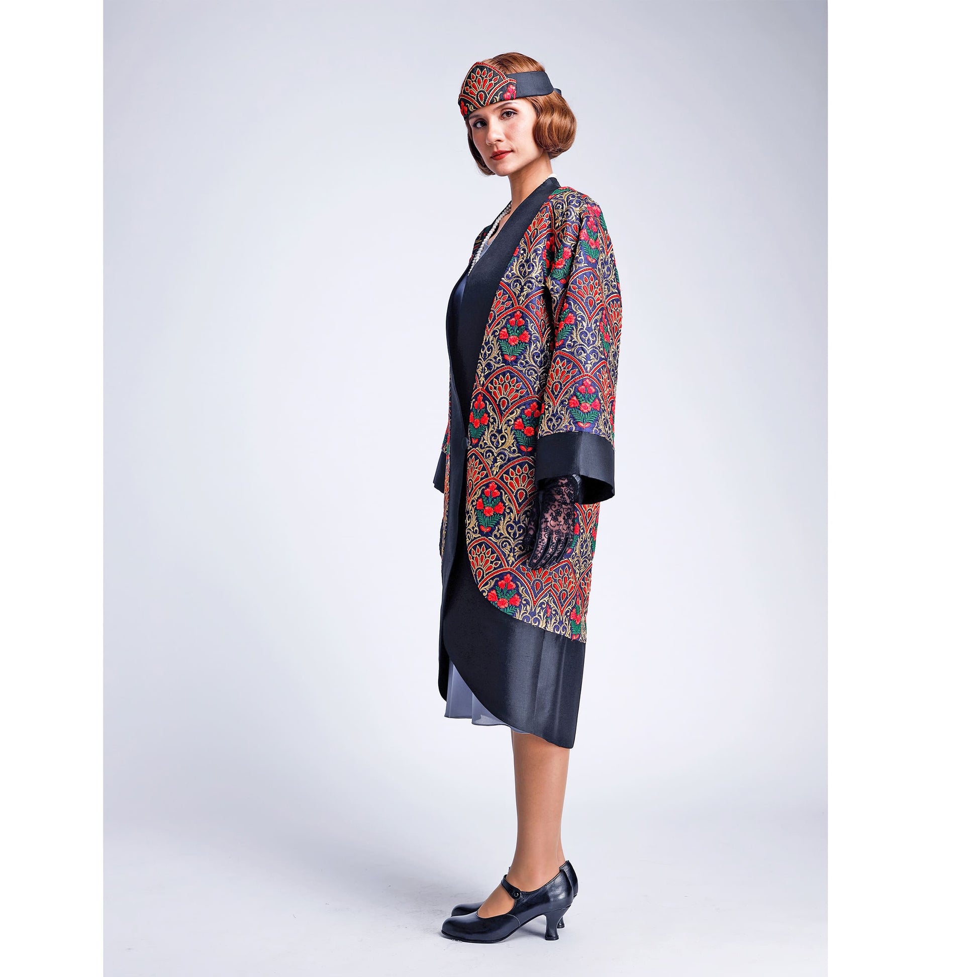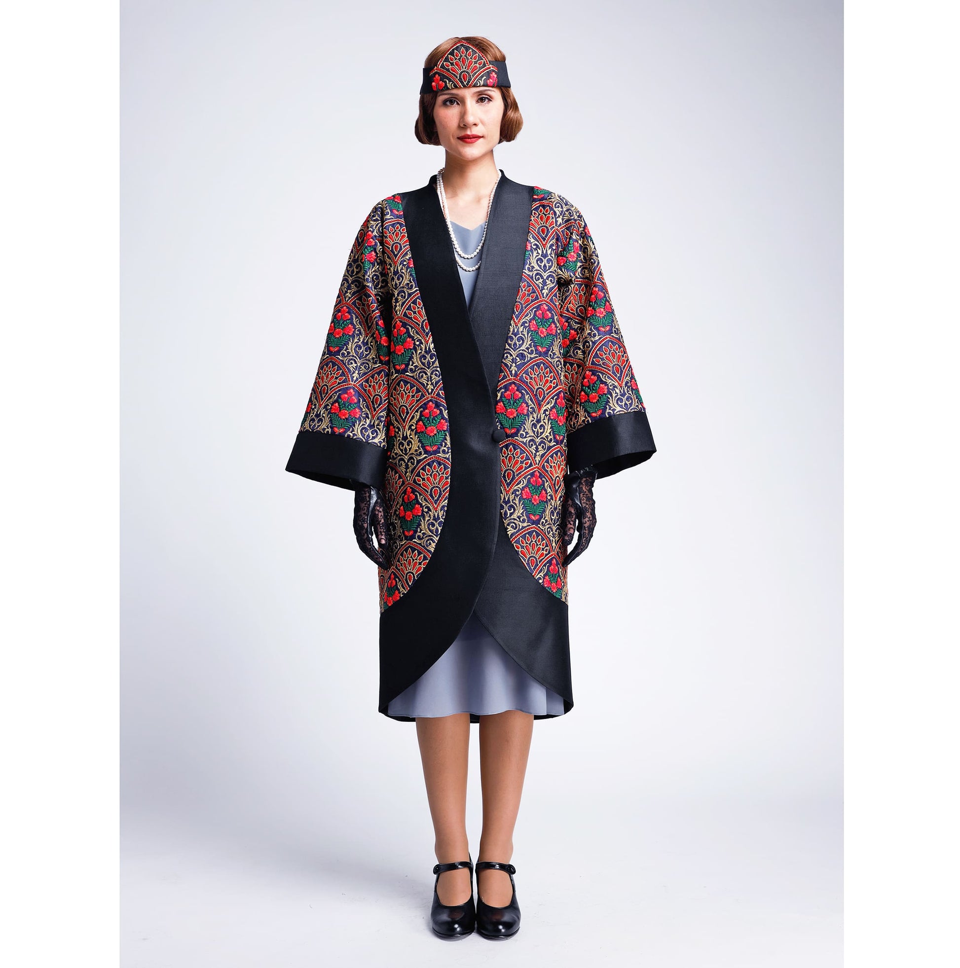 This simply wonderful Great Gatsby coat is 1920s-inspired and finely crafted from art deco embroidered silk with blue background, of which we have very limited amount. We can offer only 4 coats in this color combination. This handmade blue silk art deco coat, or silk kimono jacket or cocoon coat, is exquisite 1920s fashion.