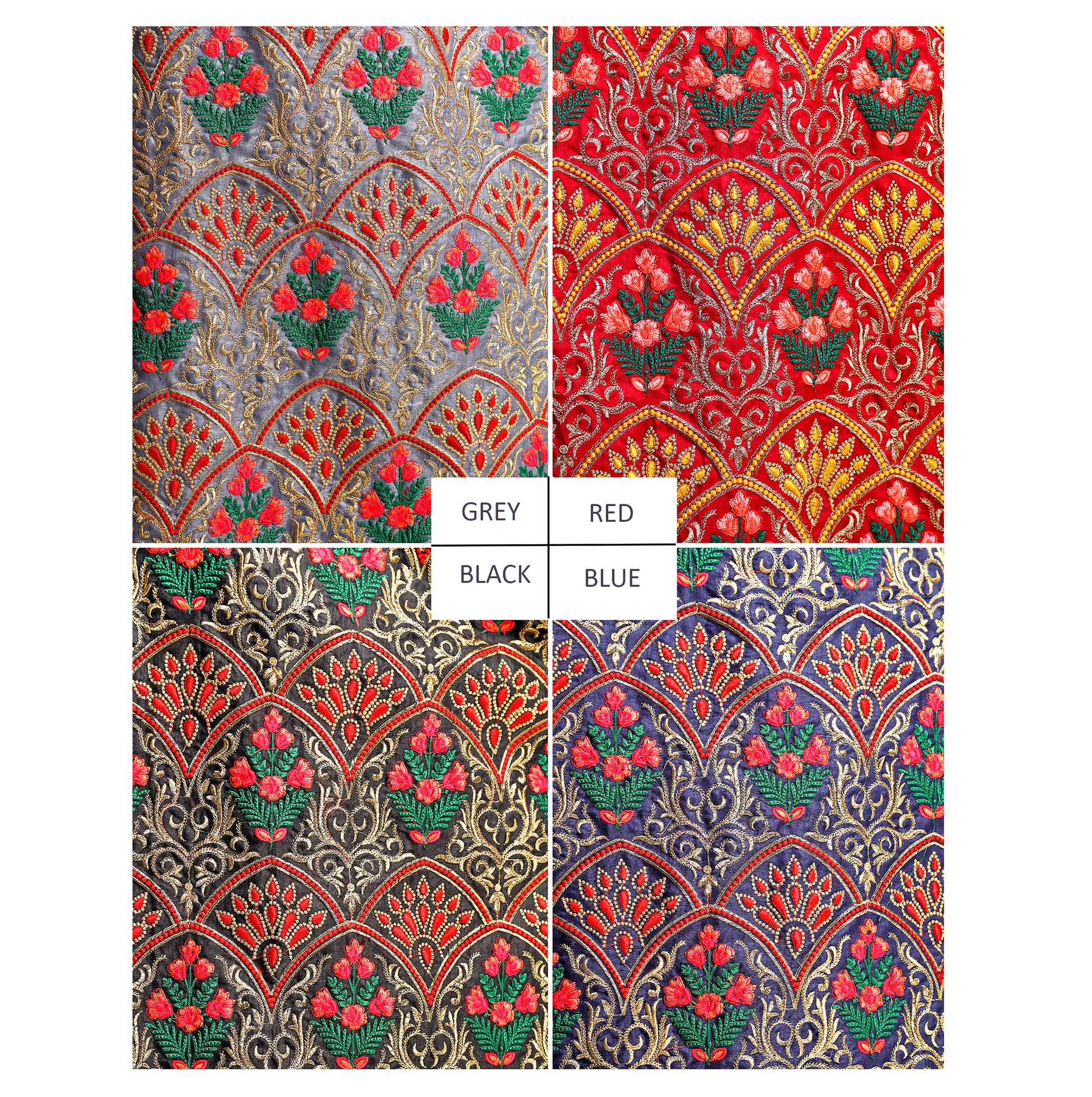 - Embroidered dupioni silk with blue background (75% silk, 25% polyester)