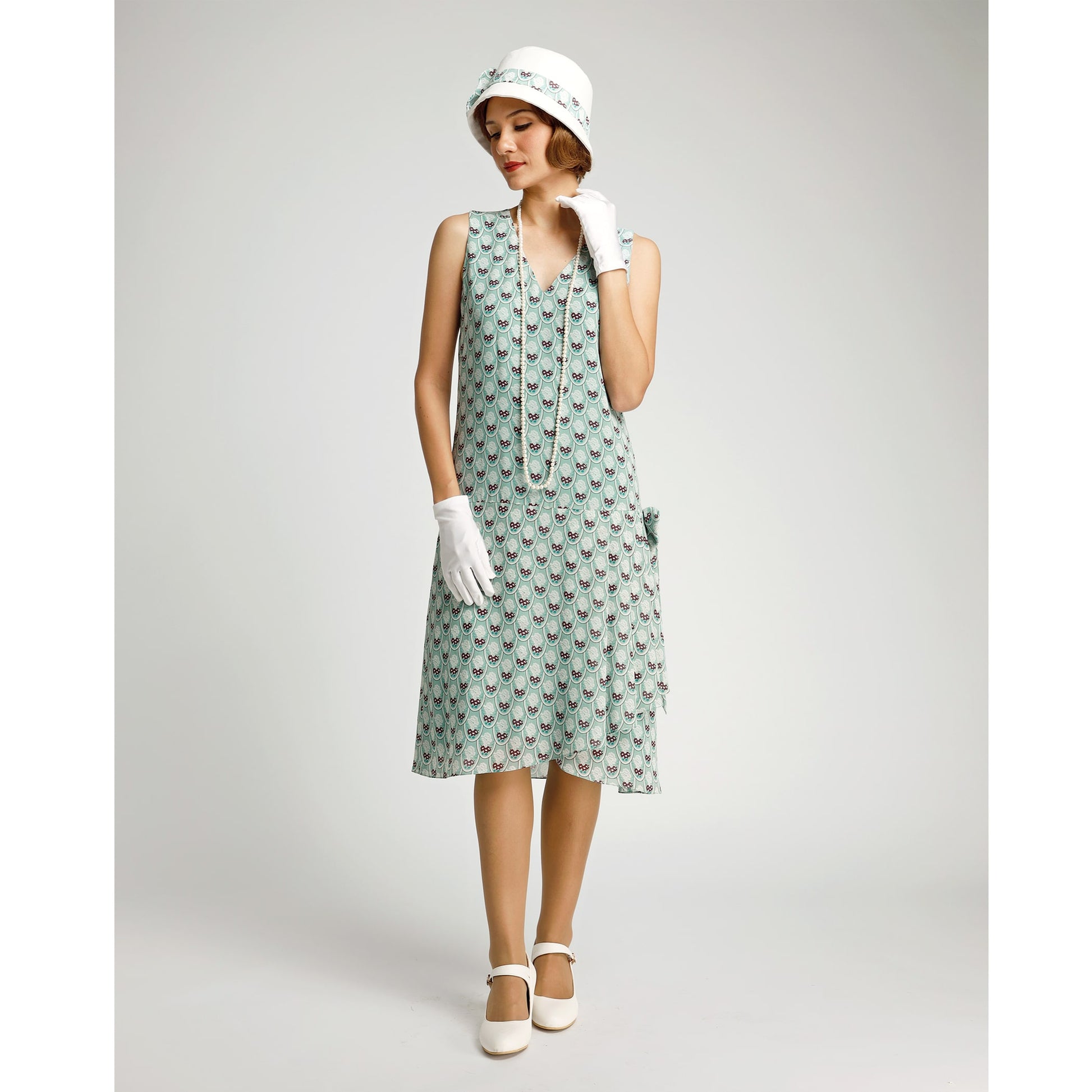 Get ready to take a journey back to the roaring twenties with this chiffon 1920s day dress in green deco print with drape and bow. This 1920s fashion dress can be worn as a green high tea dress, a Downton Abbey dress or a Great Gatsby summer dress, among others.