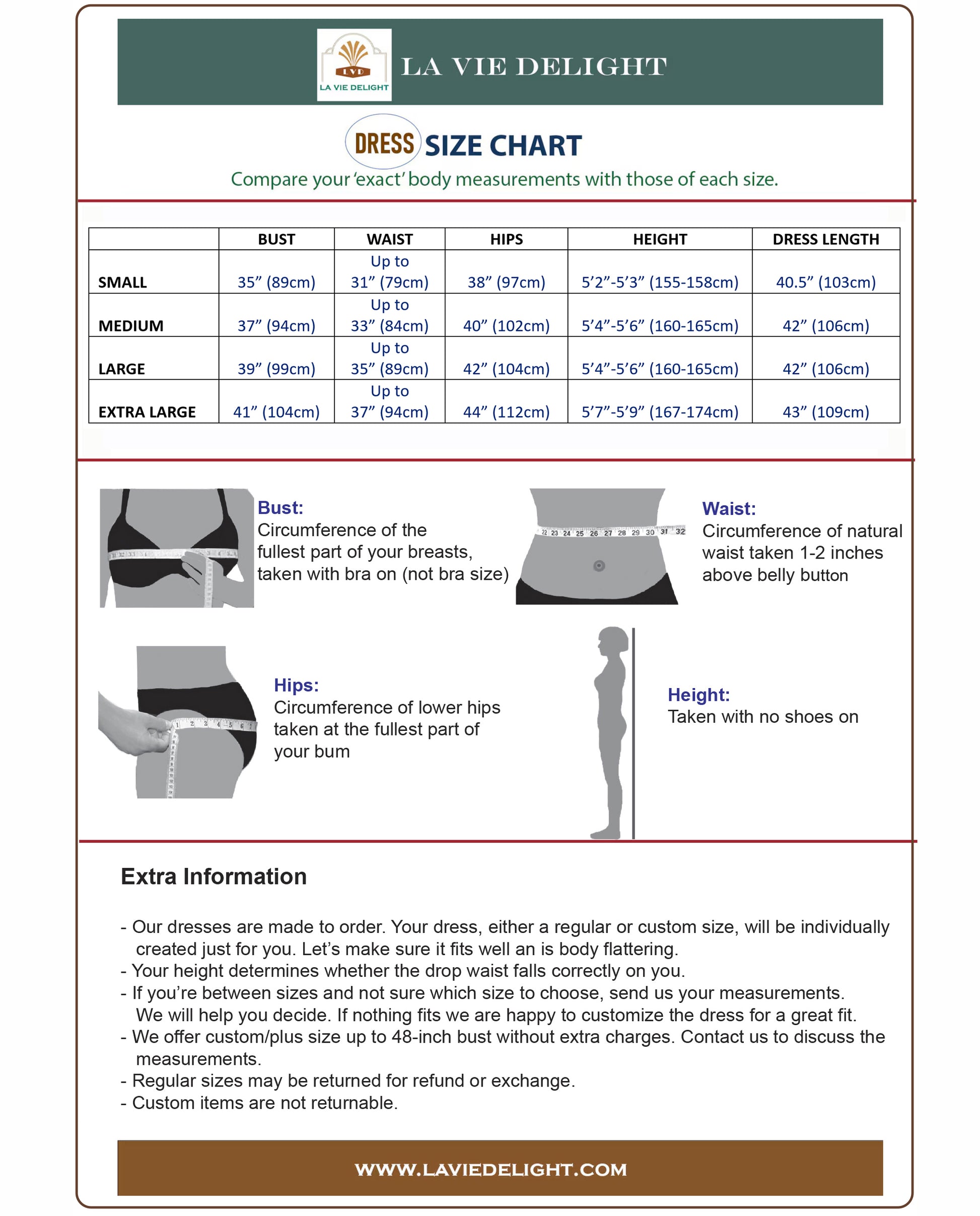 Make sure you know your 'exact' body measurements, which have been measured correctly as instructed in the Size Chart. If you are between sizes send us your measurements and height. We will help consider whether you need a custom size. Most of the time we encourage you have your clothes customized to your body measurements and height so that they fit well, correctly and are body flattering. And you will look great and feel confident in them. We offer custom orders of up to person's bust of 48”. There are no extra fees for size customization. However, a custom item cannot be returned for refund or exchange. Please contact us first if you would like a custom item before placing your order.