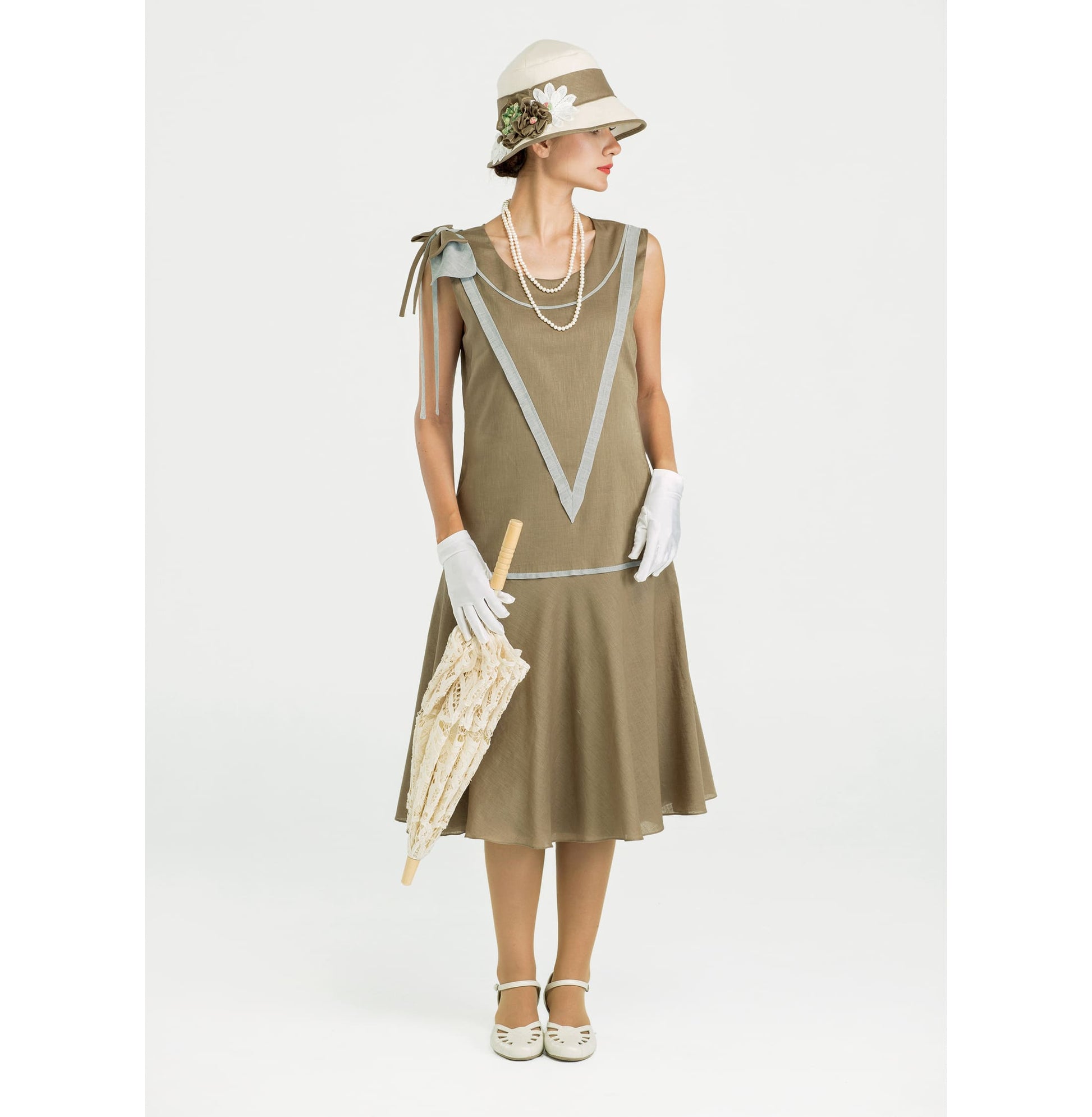This 1920s party dress is made of quality linen fabric in olive green with grey contrast details. It is handmade and is sleeveless. This 20s high tea dress can be worn, for instance, as a roaring 20s flapper dress or a Downton Abbey day dress. It is a unique and stylish dress for a Jazz Age lawn party or an art deco festival.