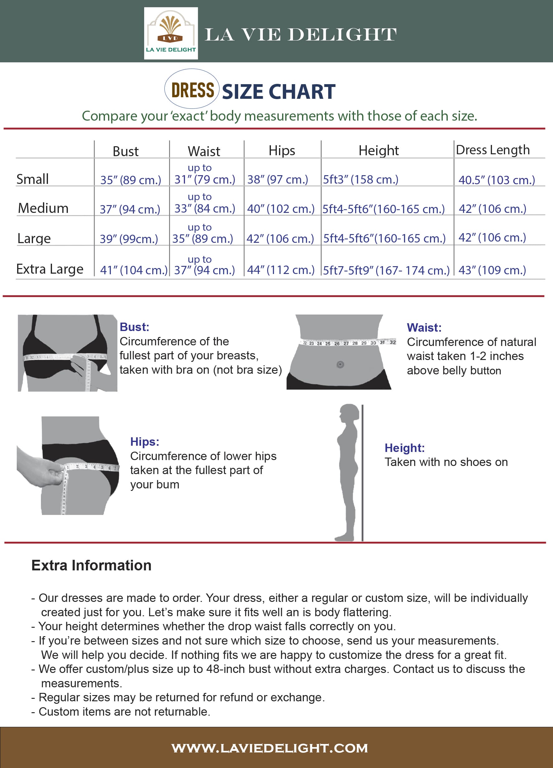 Make sure you know your 'exact' body measurements, which have been measured correctly as instructed in the Size Chart. If you are between sizes send us your measurements and height. We will help consider whether you need a custom size. Most of the time we encourage you have your clothes customized to your body measurements and height so that they fit well, correctly and are body flattering. And you will look great and feel confident in them. We offer custom orders of up to person's bust of 48”. There are no extra fees for size customization. However, a custom item cannot be returned for refund or exchange. Please contact us first if you would like a custom item before placing your order.