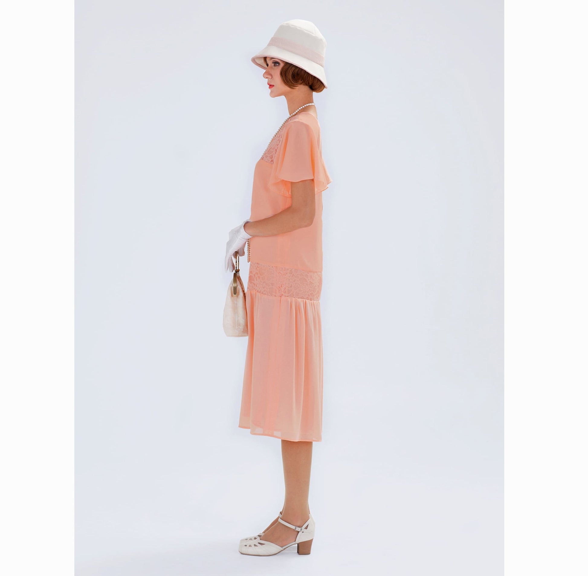 This Downton Abbey dress is made of peach chiffon and lace fabrics. The handmade roaring 20s fashion robe has flutter sleeves and can be worn as a 20s high tea dress, a flapper dress, a Great Gatsby dress or a roaring twenties lawn party dress, among others. It is also very suitable as a 1920s bridesmaid dress.