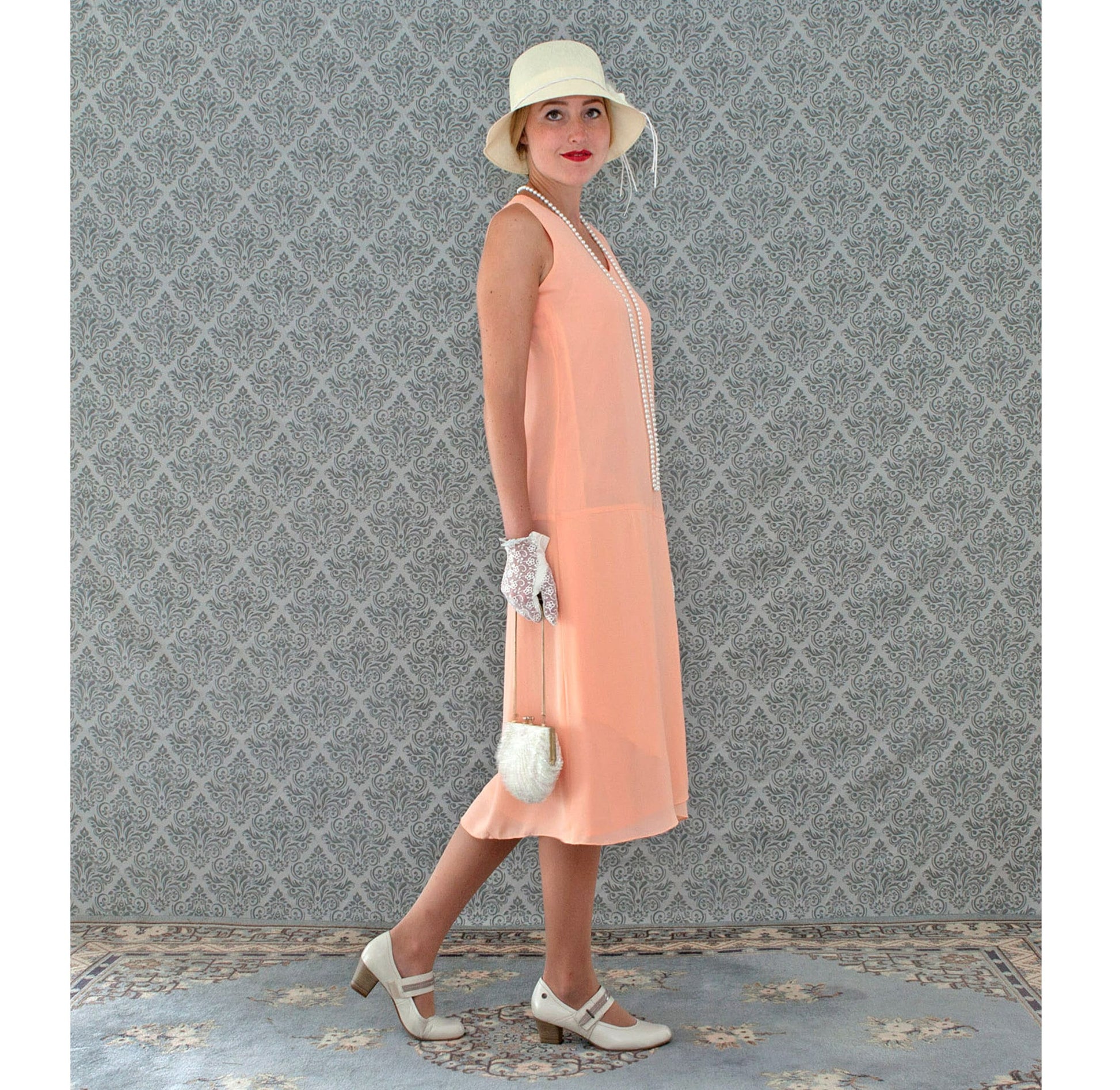 With this peach chiffon roaring twenties dress you will shine and sparkle at your next 1920s themed party. It's handmade and has a drape and bow. This '1920er kleider' can be worn, for example, as an orange 1920s flapper dress, a Downton Abbey dress or a peach Great Gatsby party dress.