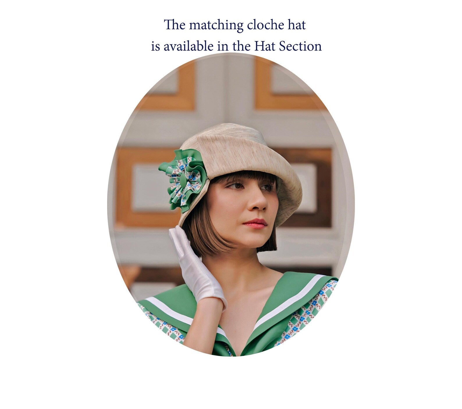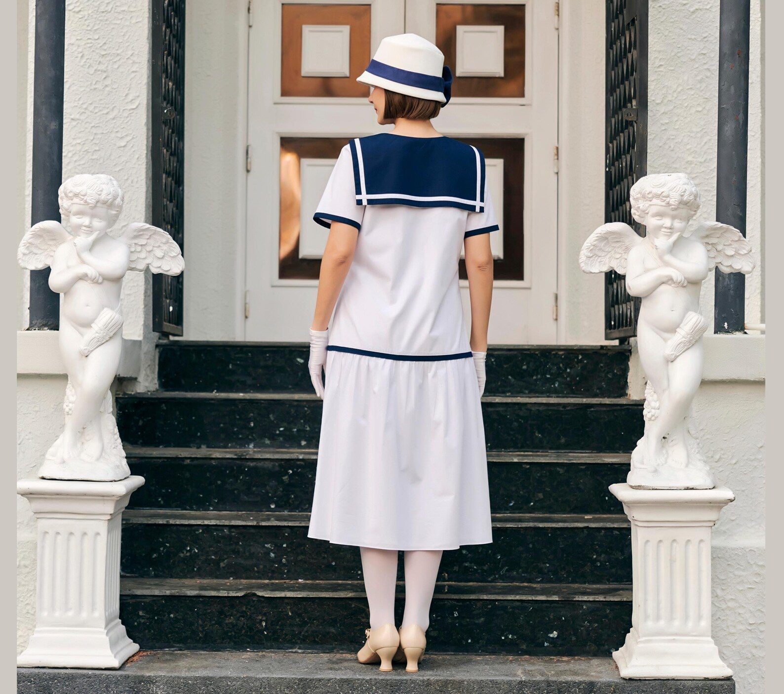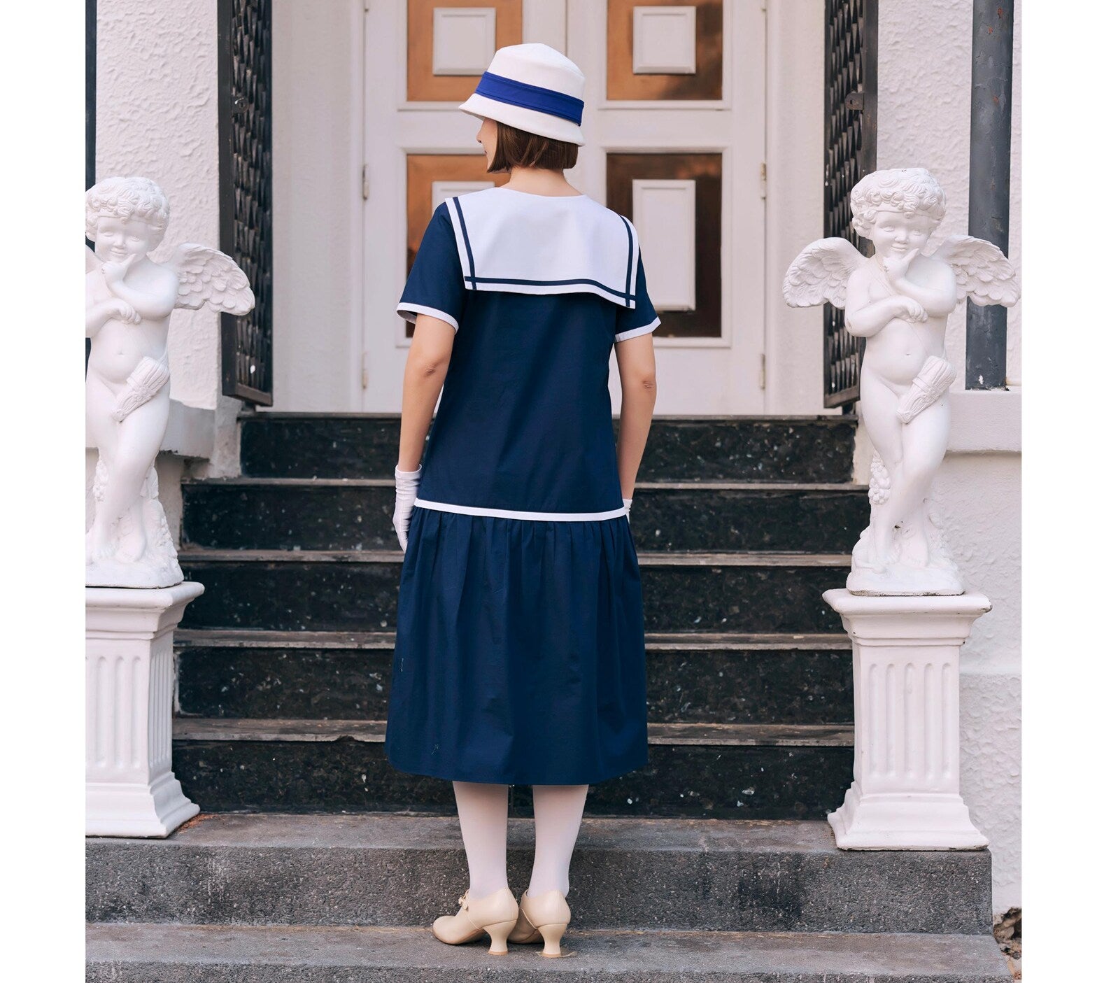 With its sailor dress design and soft cotton fabric, this roaring twenties dress evokes the timeless style of a Great Gatsby day dress while adding a modern, nautical twist. This flapper dress in printed green with a sailor collar combines vintage elegance and nautical charm, making it the perfect 1920s day dress. Whether you're strolling by the shore or heading to a Gatsby-inspired gathering, this cotton nautical dress is a must-have for any vintage lover.