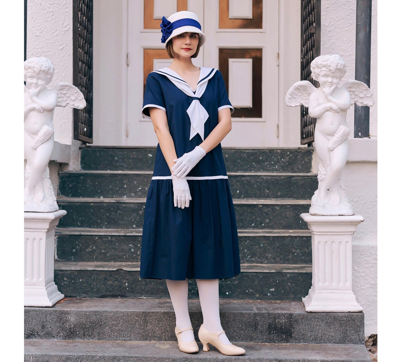 The dress length is a couple of inches below the knee or depending on your height. Check length details below for each size. Please note that because of its drop waist, the dress will look less flattering or less correct if you are a lot shorter or taller than the person’s height recommended for each size. In that case, we recommend ordering a custom size. There are no extra charges for the customization. Contact us for this.