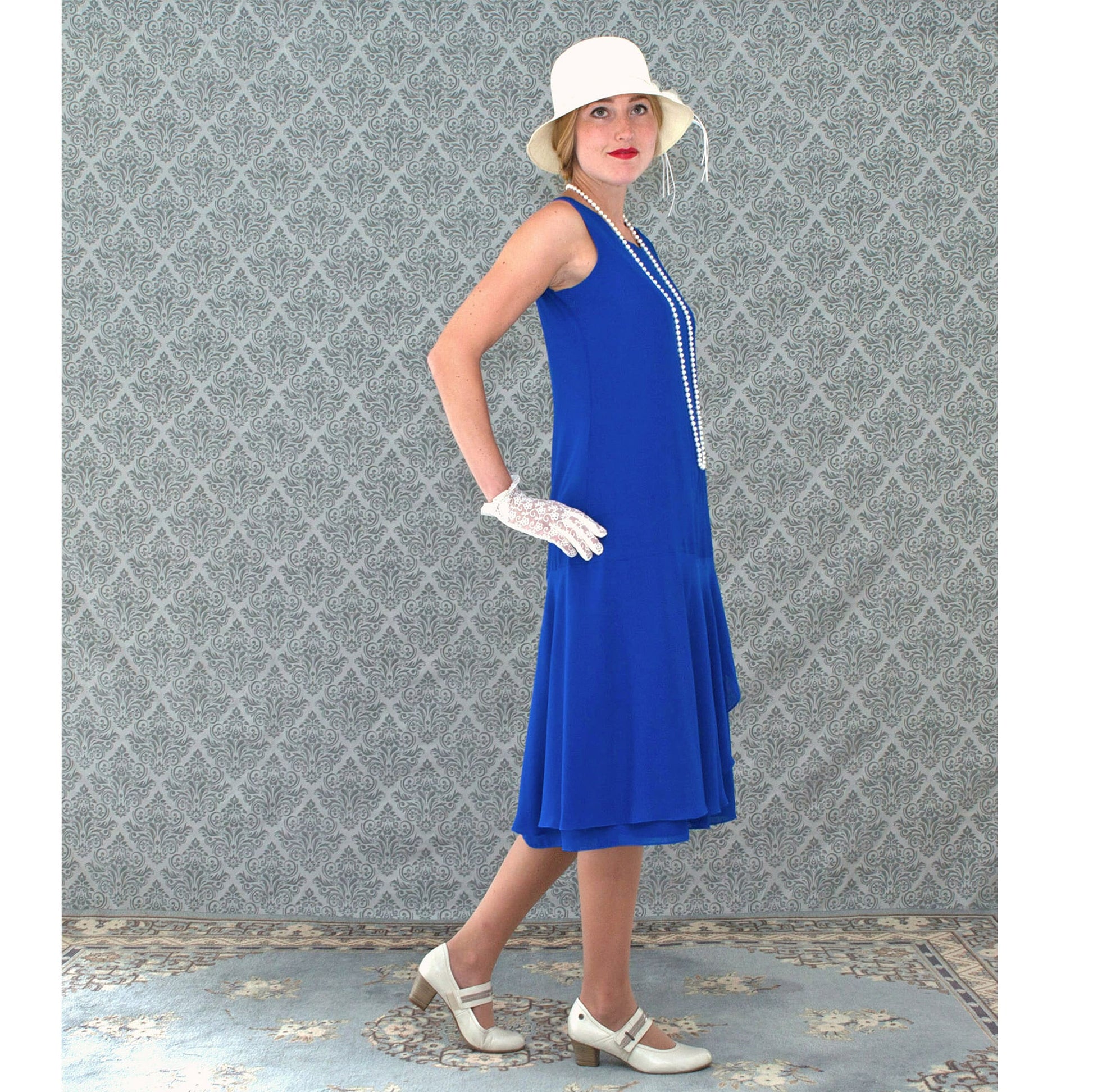 This 1920s handmade drop waist flapper gown is made of sapphire blue chiffon. The blue shade is not as dark as navy and gives lovely bright tint of color. This '1920er jahre kleider' with ruffled skirt can be worn as a Great Gatsby dress or a 1920s flapper dress, among others. A stylish dress for any Roaring 20s party.