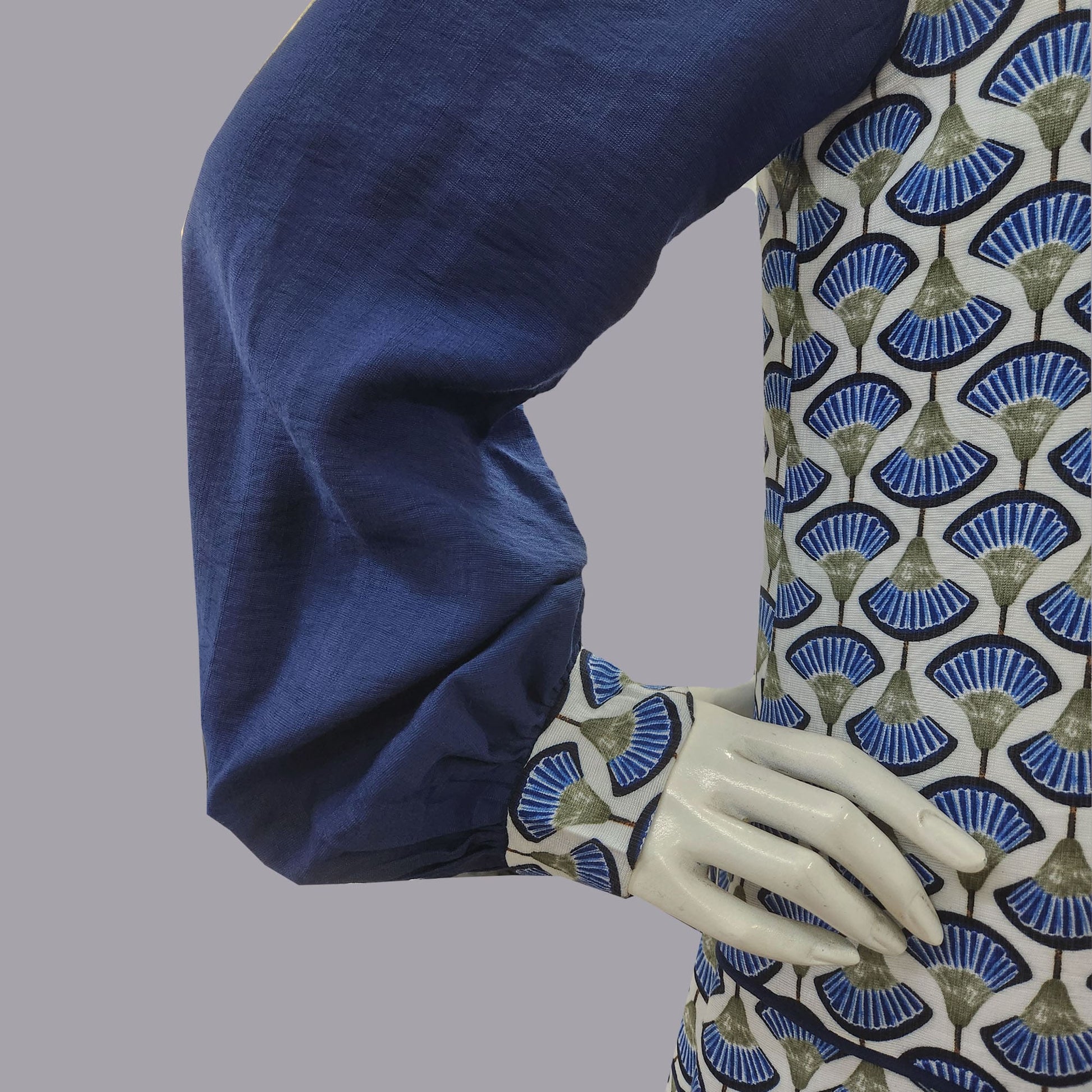 A bias-cut skirt ensures graceful movement, highlighted by the striking blue and ivory fan pattern — a classic Art Deco motif. Perfect for Gatsby parties, Jazz Age soirées, or modern vintage fashion lovers, this versatile midi dress blends timeless charm with effortless wearability.