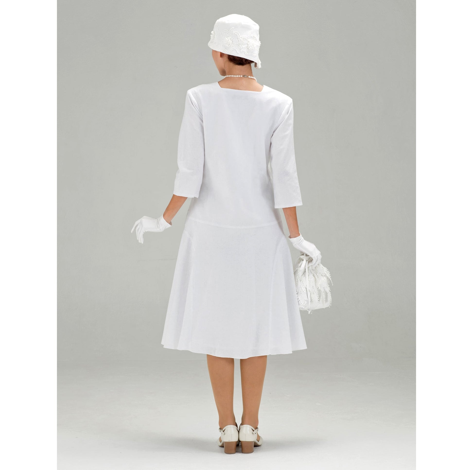 This elegant 1920s tea dress has a square neckline and 3/4 sleeves. It is 1920s daywear made of white cotton fabric. This roaring twenties day dress can be worn as a Great Gatsby dress or a Downton Abbey tea dress, among others. This dress makes a statement wherever you go, whether it’s making the rounds at a Jazz Age lawn party or swinging across the dance floor. The white cotton fabric is light weight and has a lovely texture.