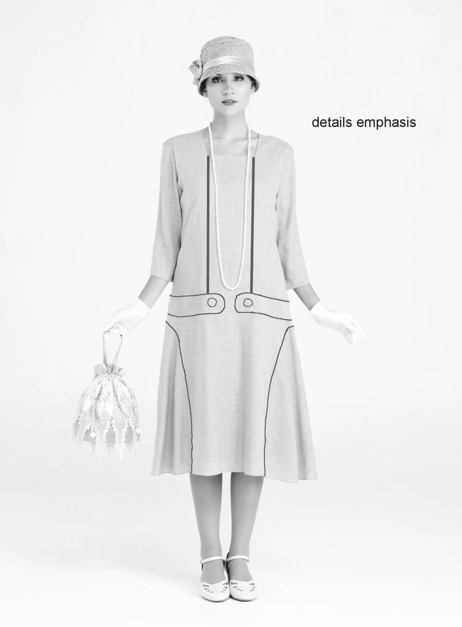 The dress comes with a square neckline, 3/4 sleeves and features fine details popular during the 1920s, such as the vertical seams on the front bodice, the decorative belts and buttons, and the biased-cut side panels of the skirt.