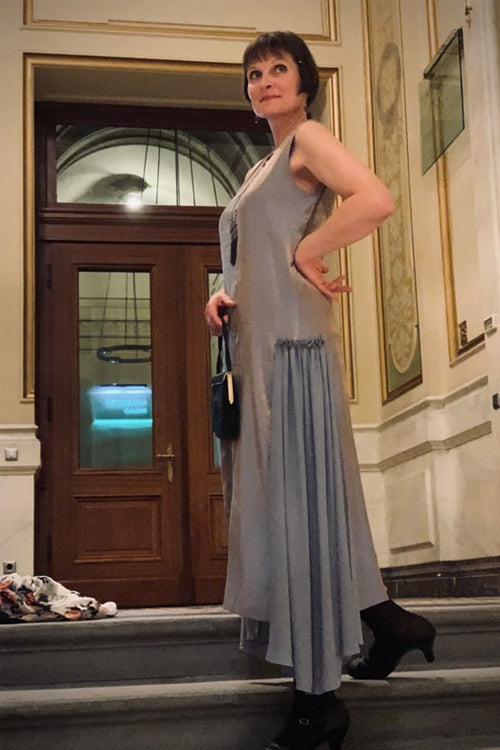 1920s dress in grey chiffon with drape and bow