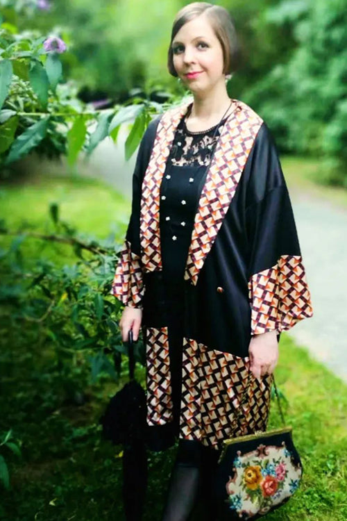 Black 1920s fashion inspired satin kimono robe with brown print